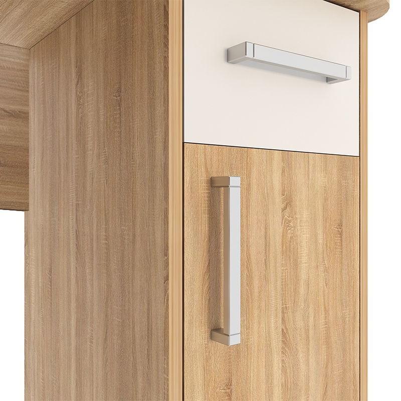 Стол выполнен из качественного материала ЛДСП в цвете дуб сонома с белыми элементами. Особенностью дизайна являются радиусные элементы и утолщенная столешница толщиной 25 мм. Для расширения функциональности стола рекомендуется дополнить его надстройкой и стеллажом из той же серии Лайт-1.