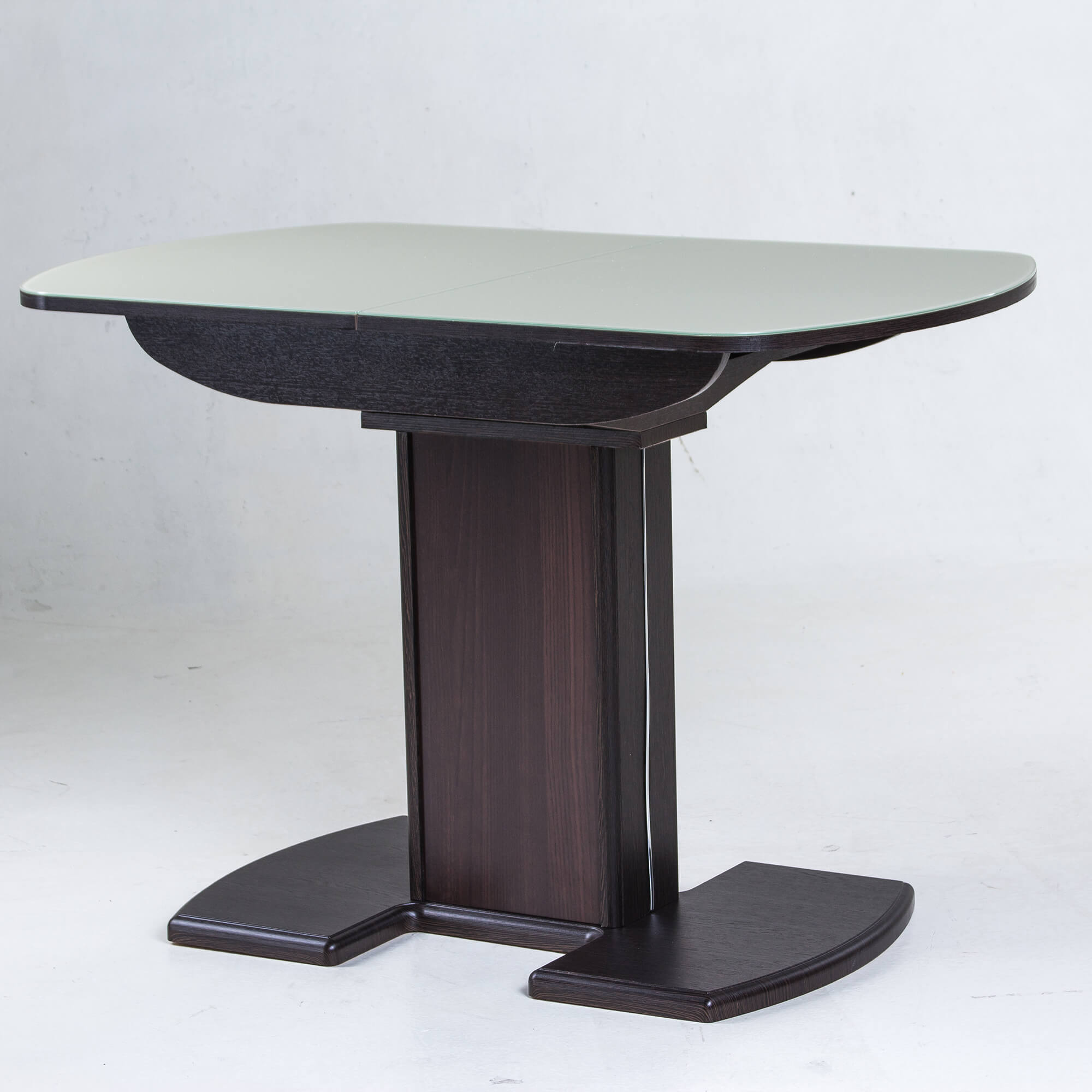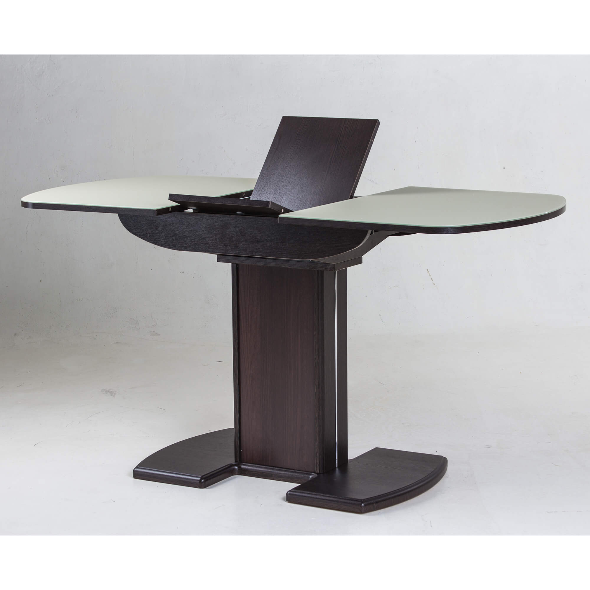 Раздвижной обеденный стол на одной опоре легко раскладывается, многофункционален, удобен. Выполнен из ЛДСП, столешница покрыта высококачественным закаленным стеклом 4 мм с безопасной фаской Safe face. Стекло окрашено немецкими керамическими красками Ferro.