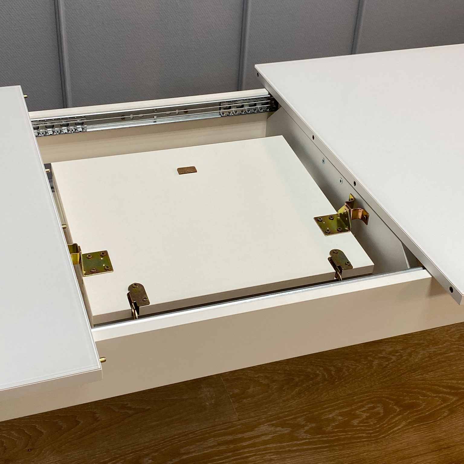 Вставка с материалом столешницы оставляет стол монолитным в разложенном состоянии. Стол максимально устойчив благодаря особому, усиленному креплению опор и регулировочным винтам.
