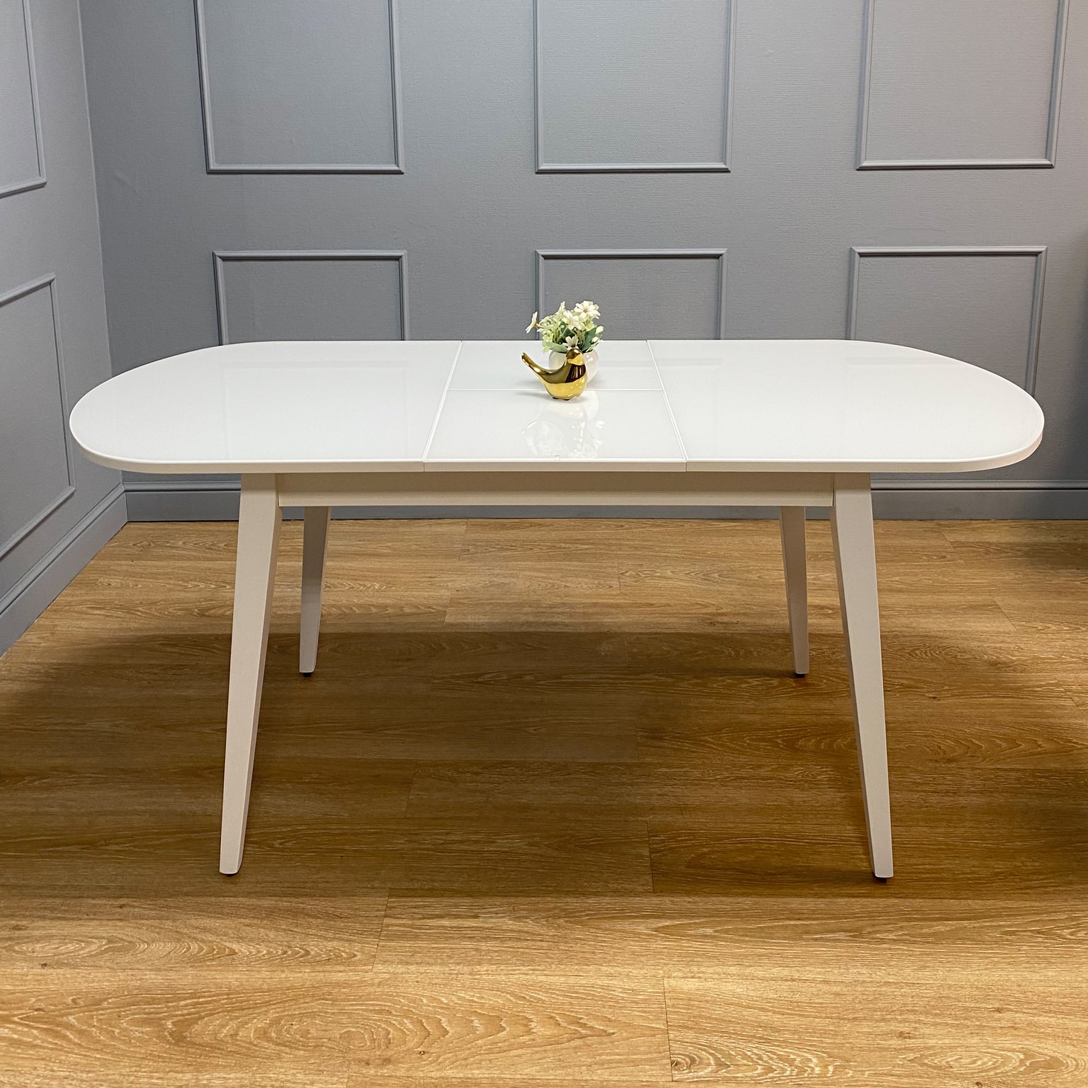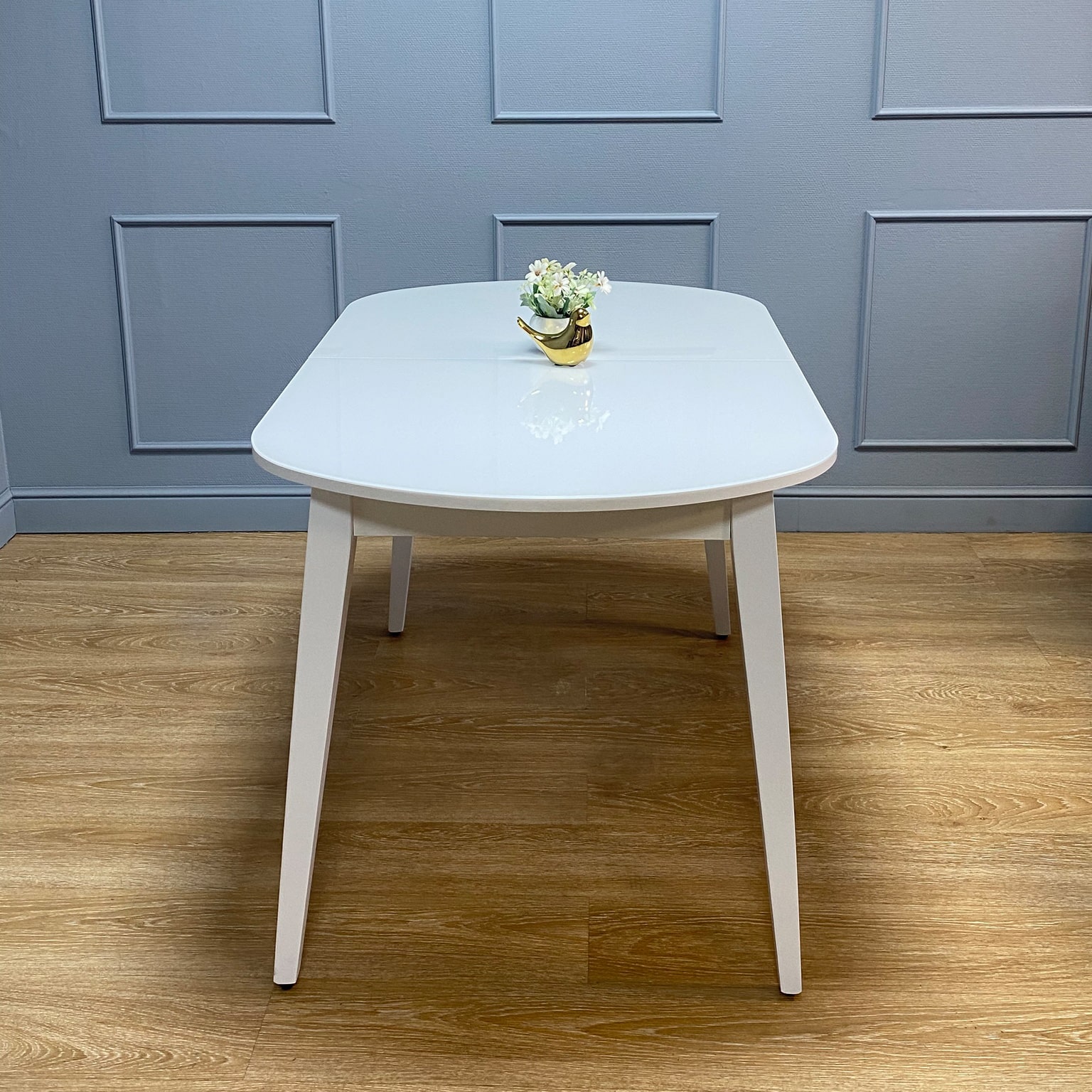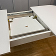 Вставка с материалом столешницы оставляет стол монолитным в разложенном состоянии. Стол максимально устойчив благодаря особому, усиленному креплению опор и регулировочным винтам.