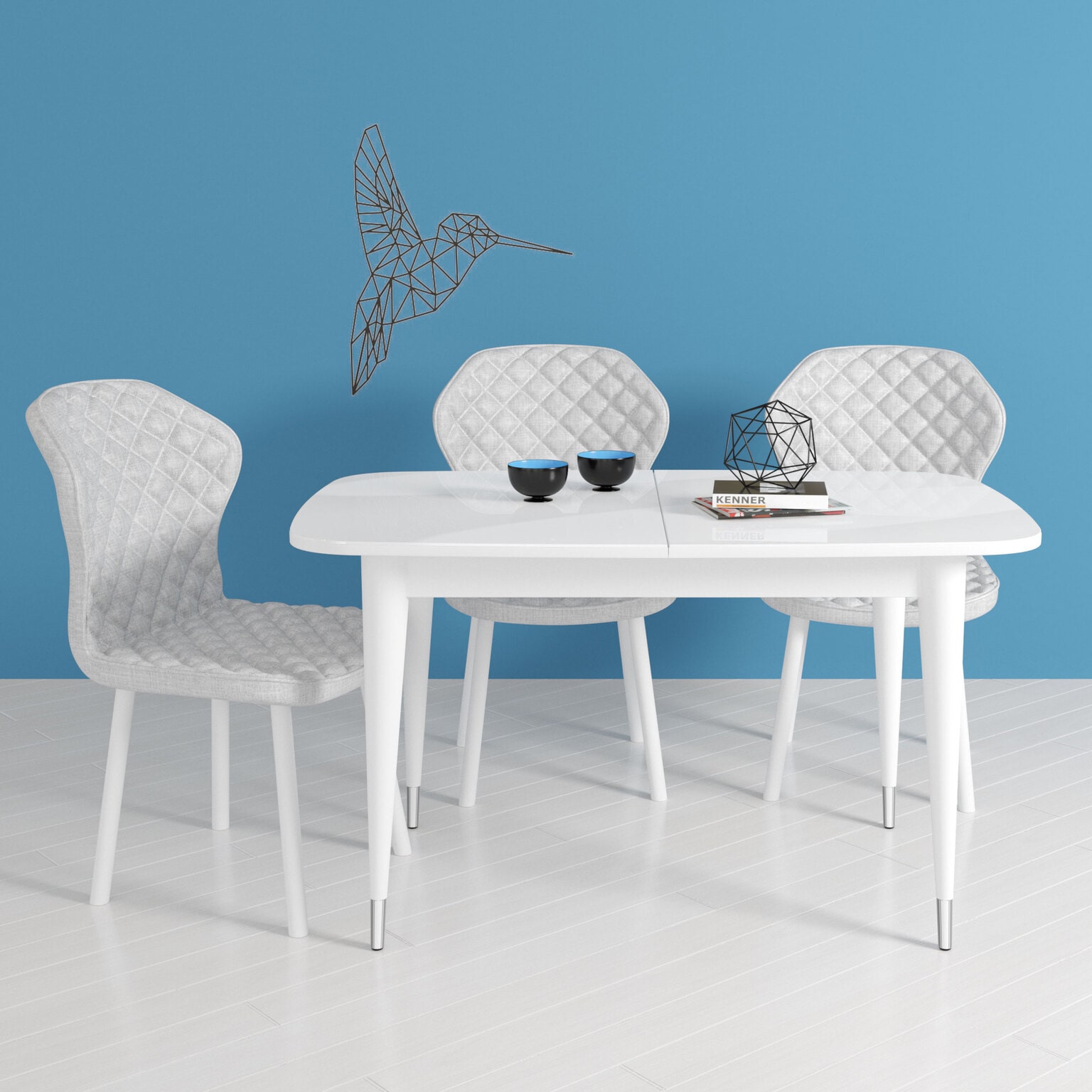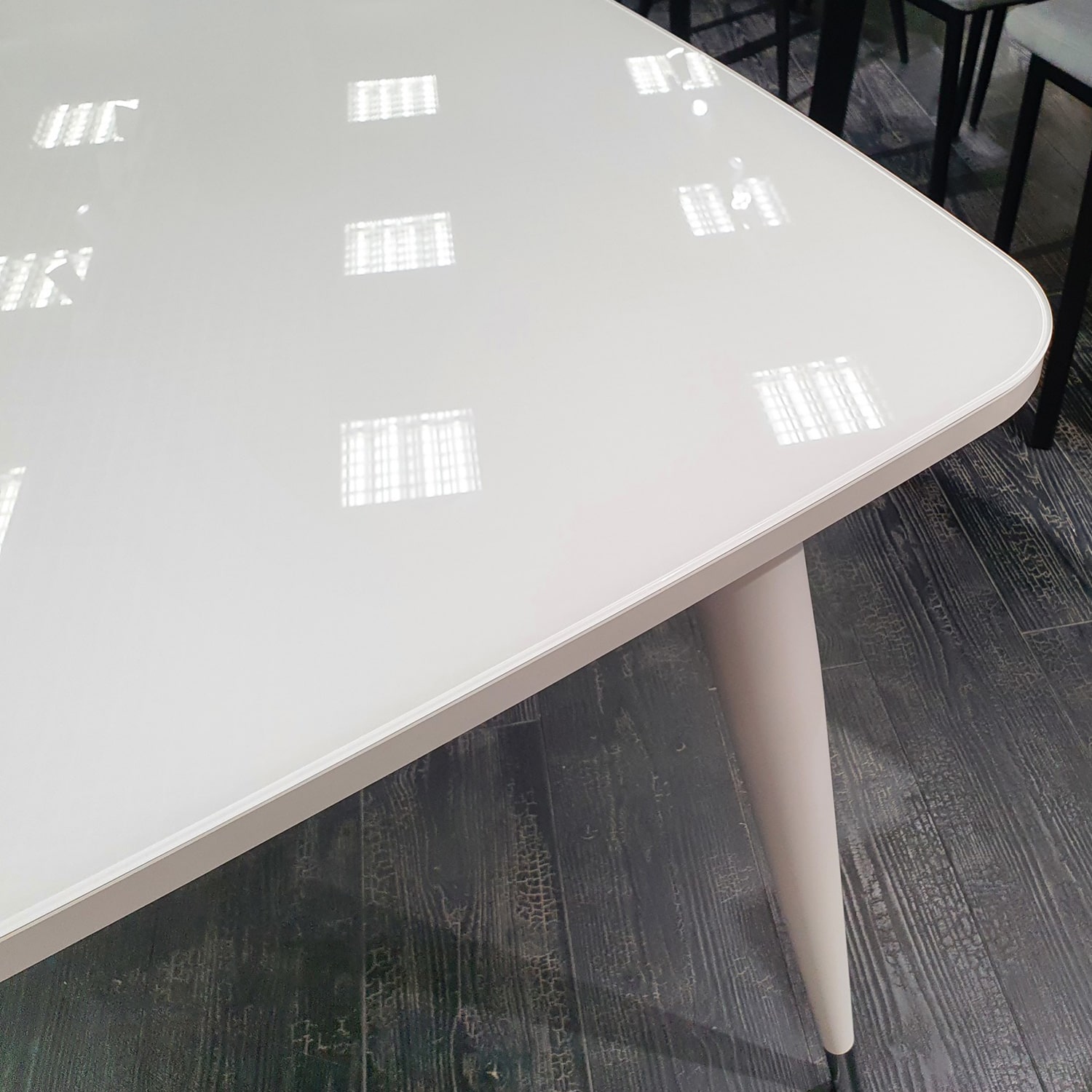 У данного стола оригинальные опоры с металлическими стаканчиками. Они не только придают оригинальность, но и защищают опоры во время влажной уборки.