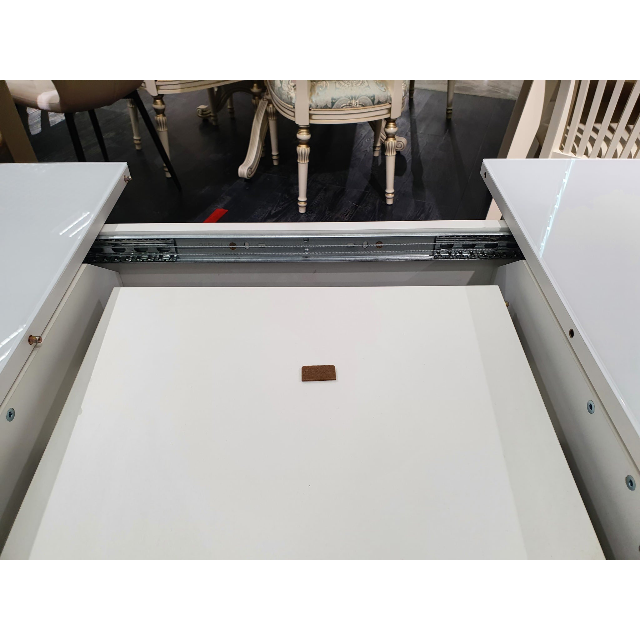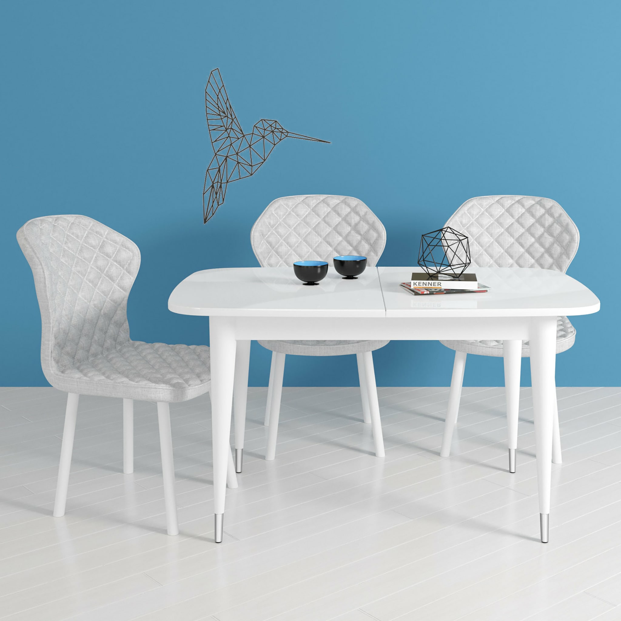 У данного стола оригинальные опоры с металлическими стаканчиками. Они не только придают оригинальность, но и защищают опоры во время влажной уборки.