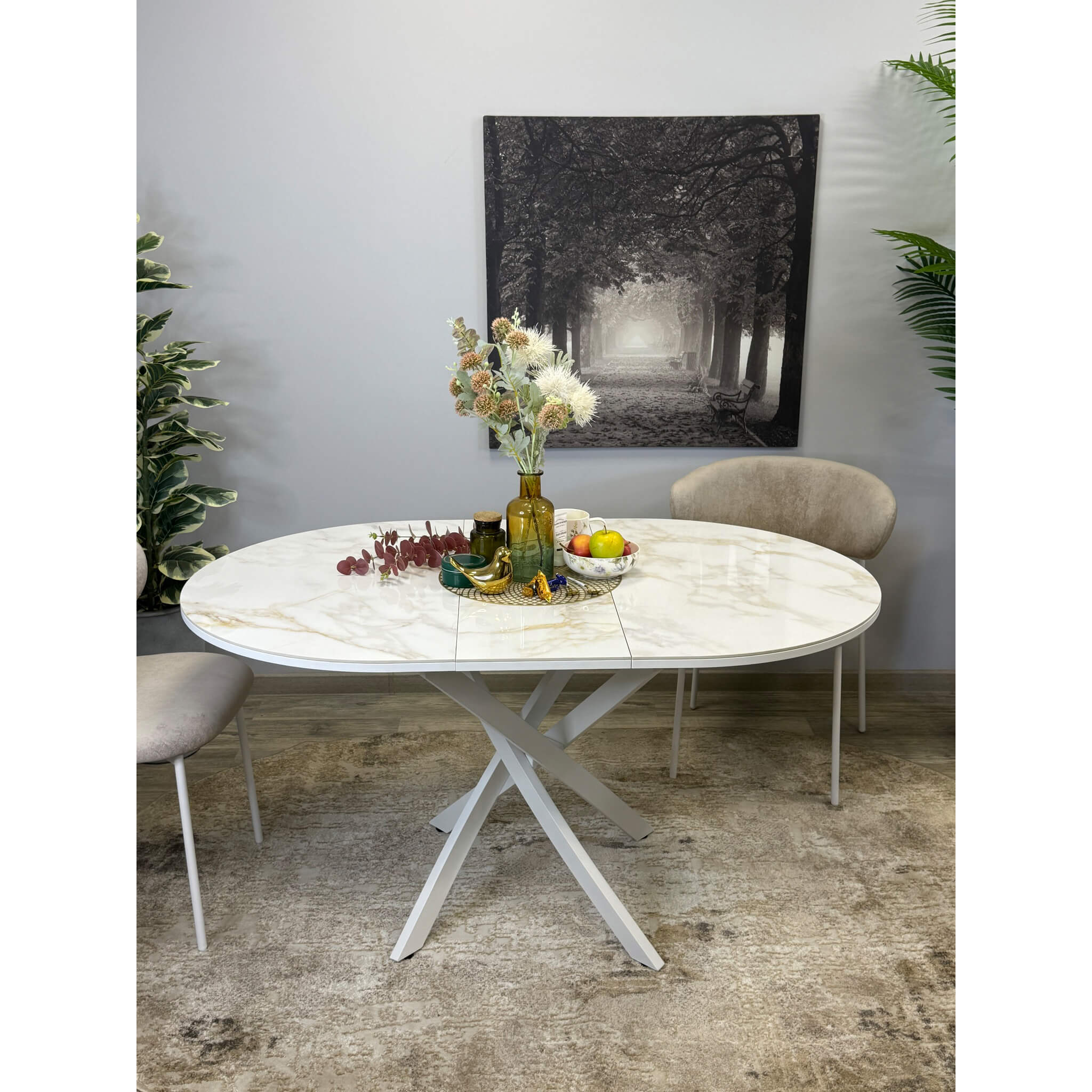 Ключевой особенностью этого стола является керамическая поверхность диаметром 100 см и долговечным, стабильным основанием. Дополняет комплект вставка на 30 см, расширяющая площадь стола.