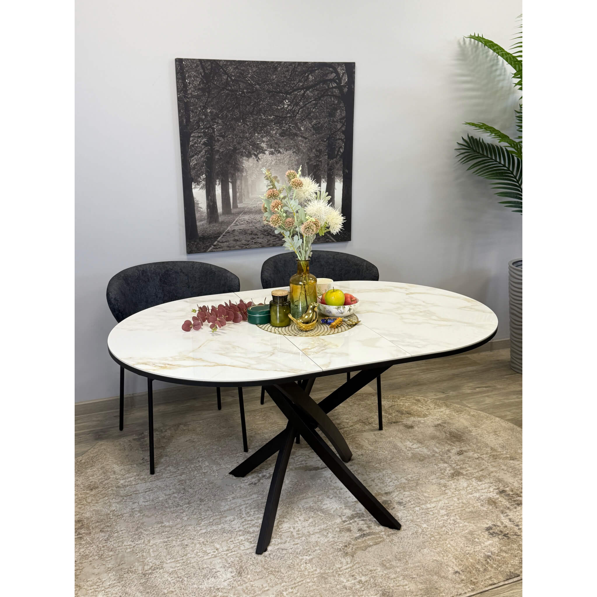 Ключевой особенностью этого стола является керамическая поверхность диаметром 100 см и долговечным, стабильным основанием. Дополняет комплект вставка на 30 см, расширяющая площадь стола.
