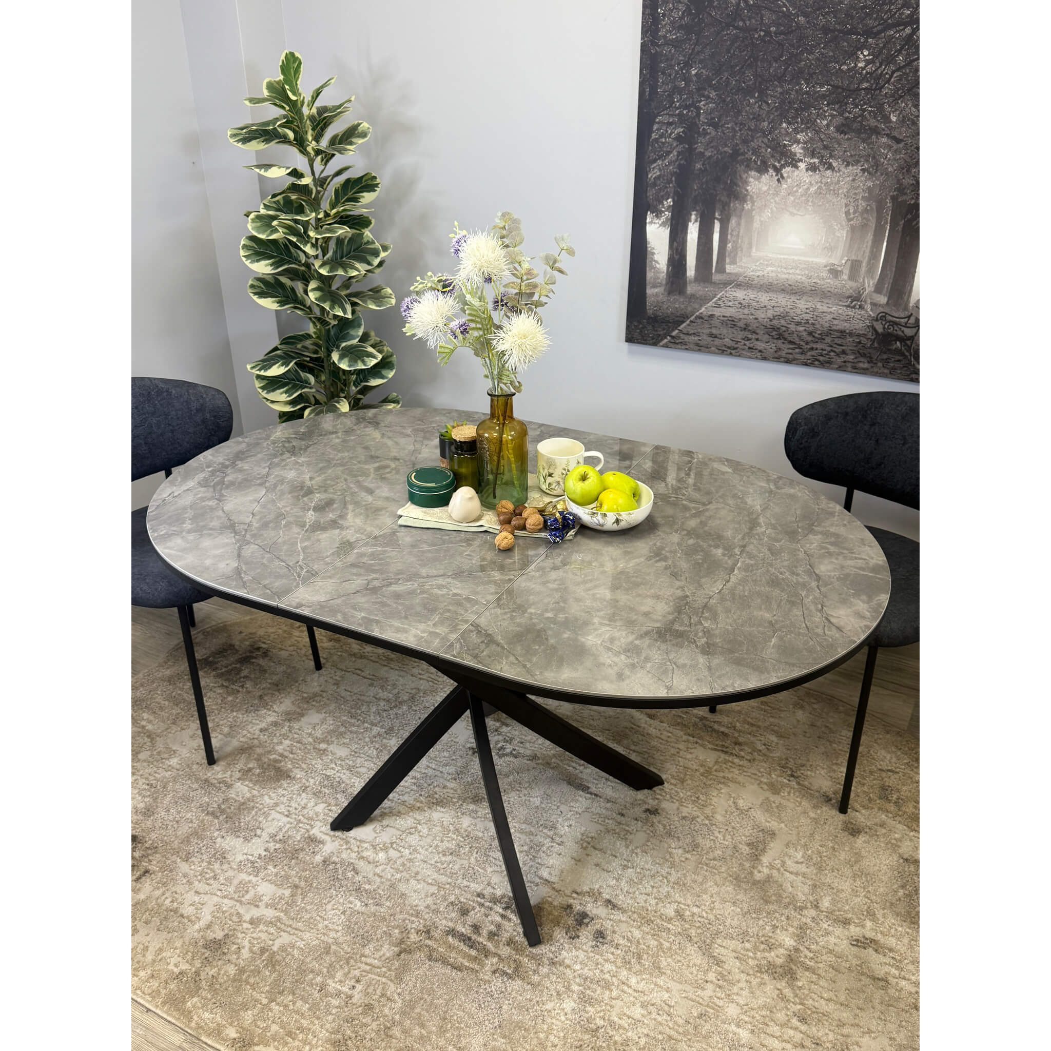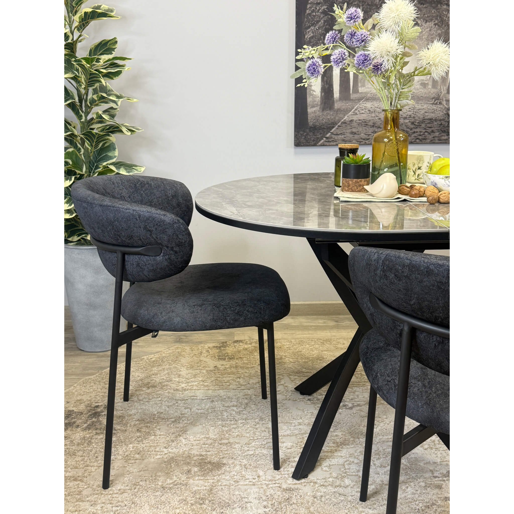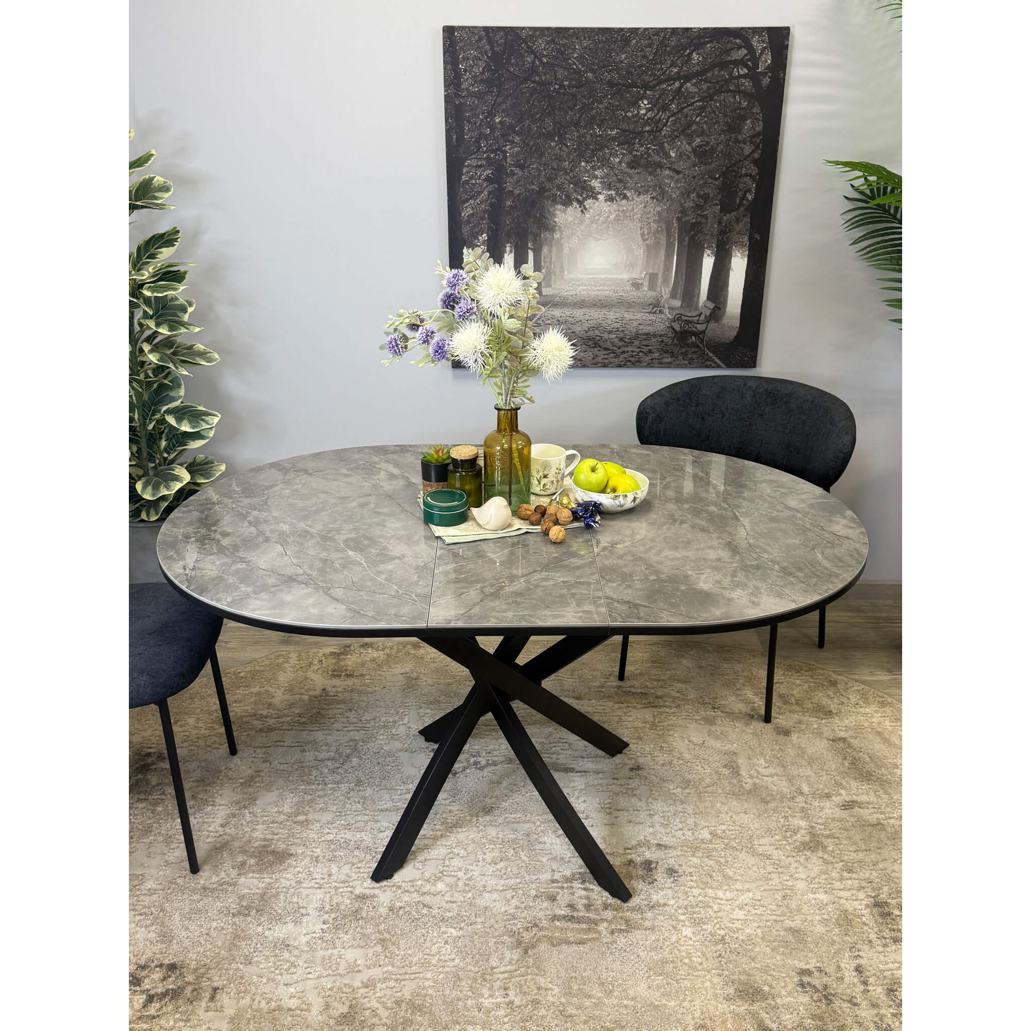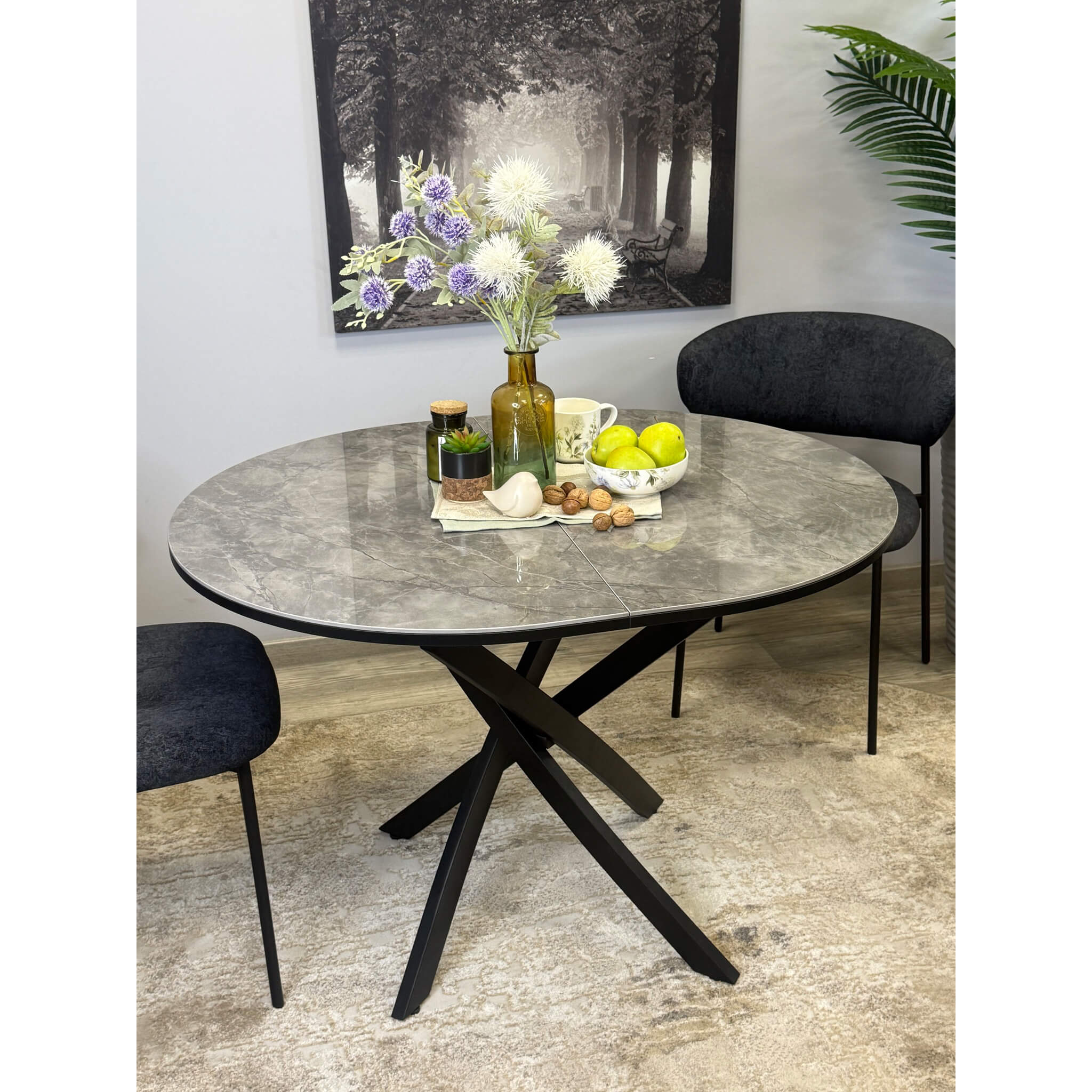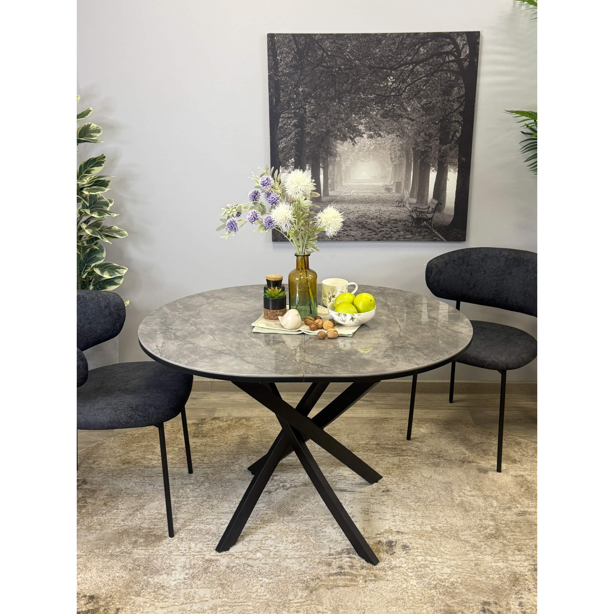 Ключевой особенностью этого стола является керамическая поверхность диаметром 100 см и долговечным, стабильным основанием. Дополняет комплект вставка на 30 см, расширяющая площадь стола.