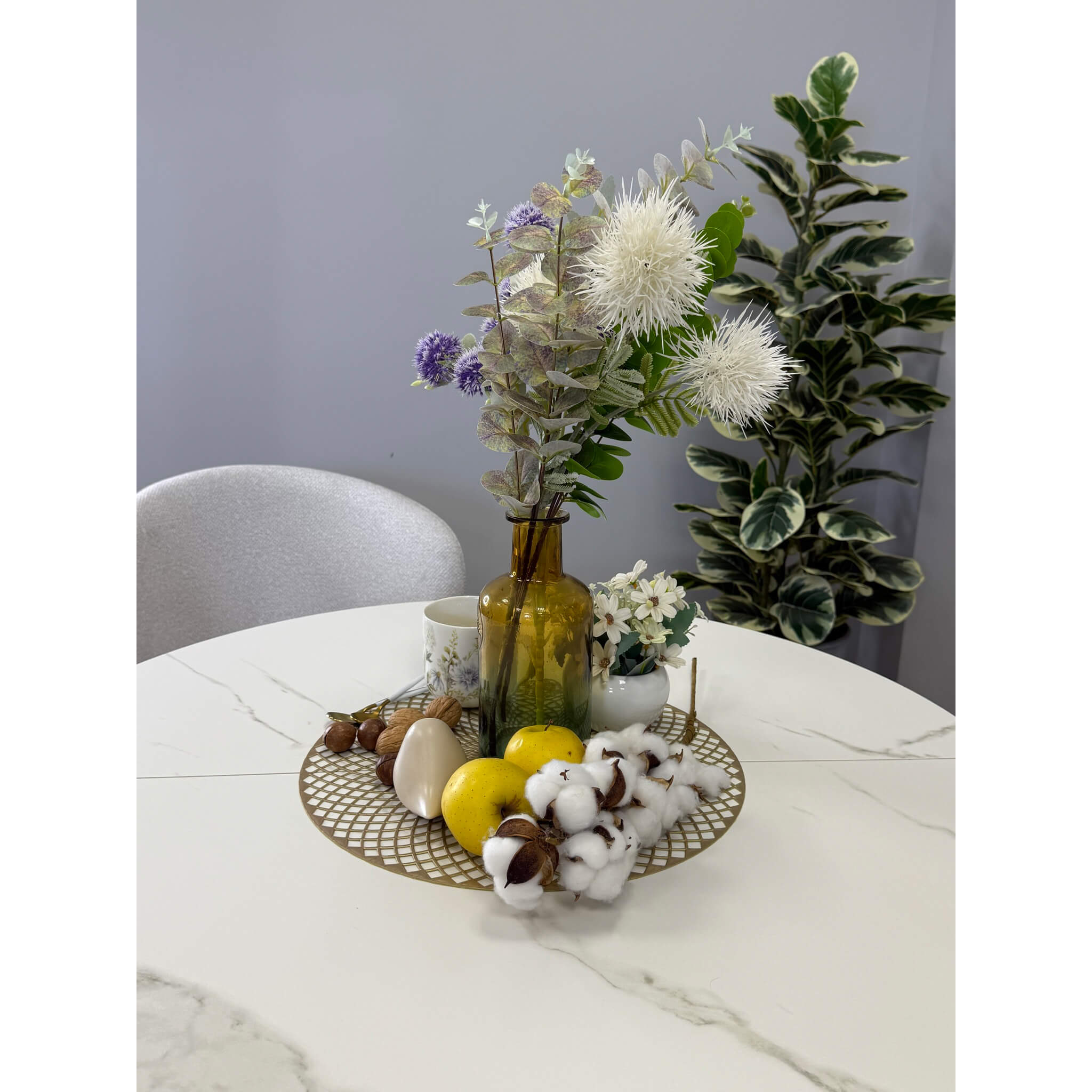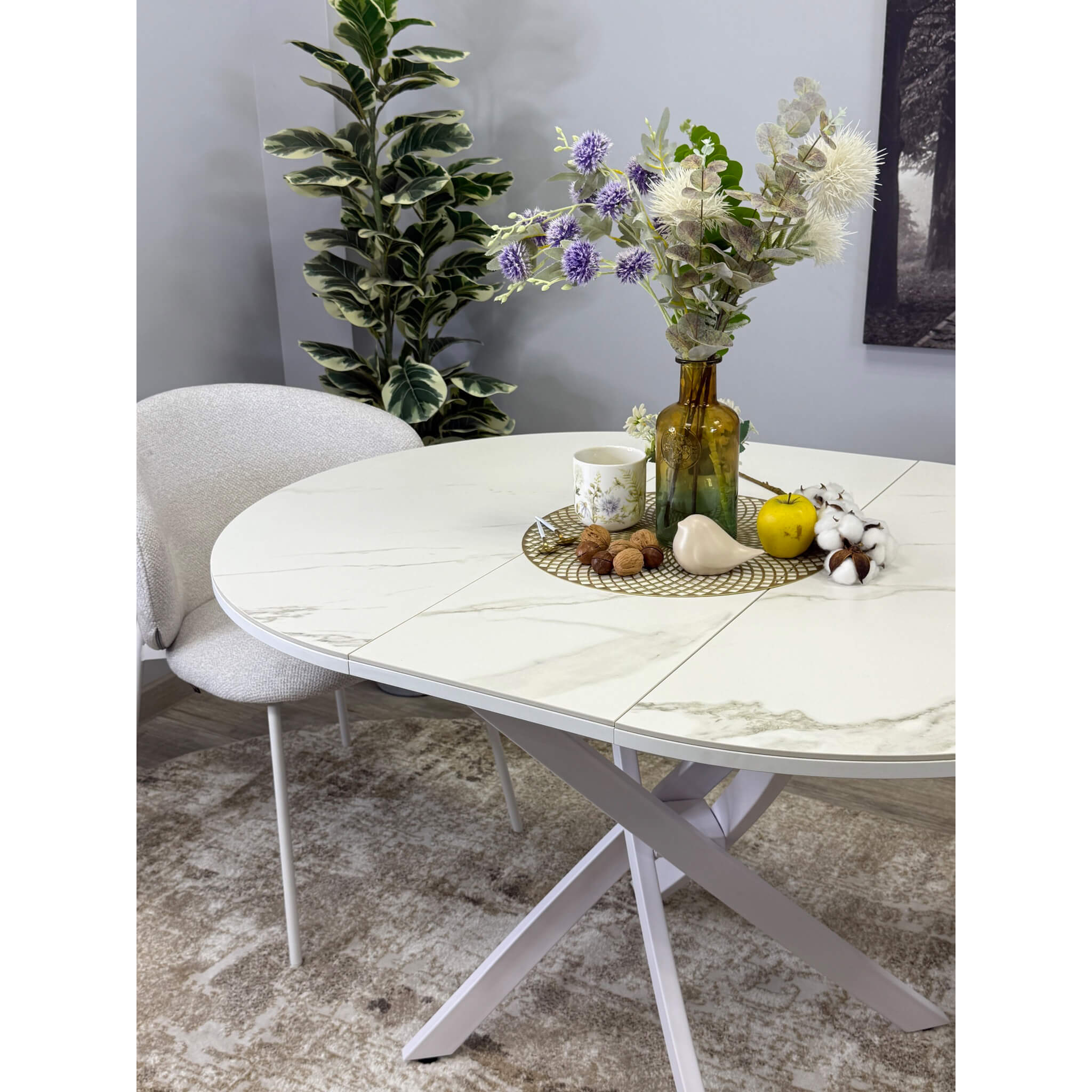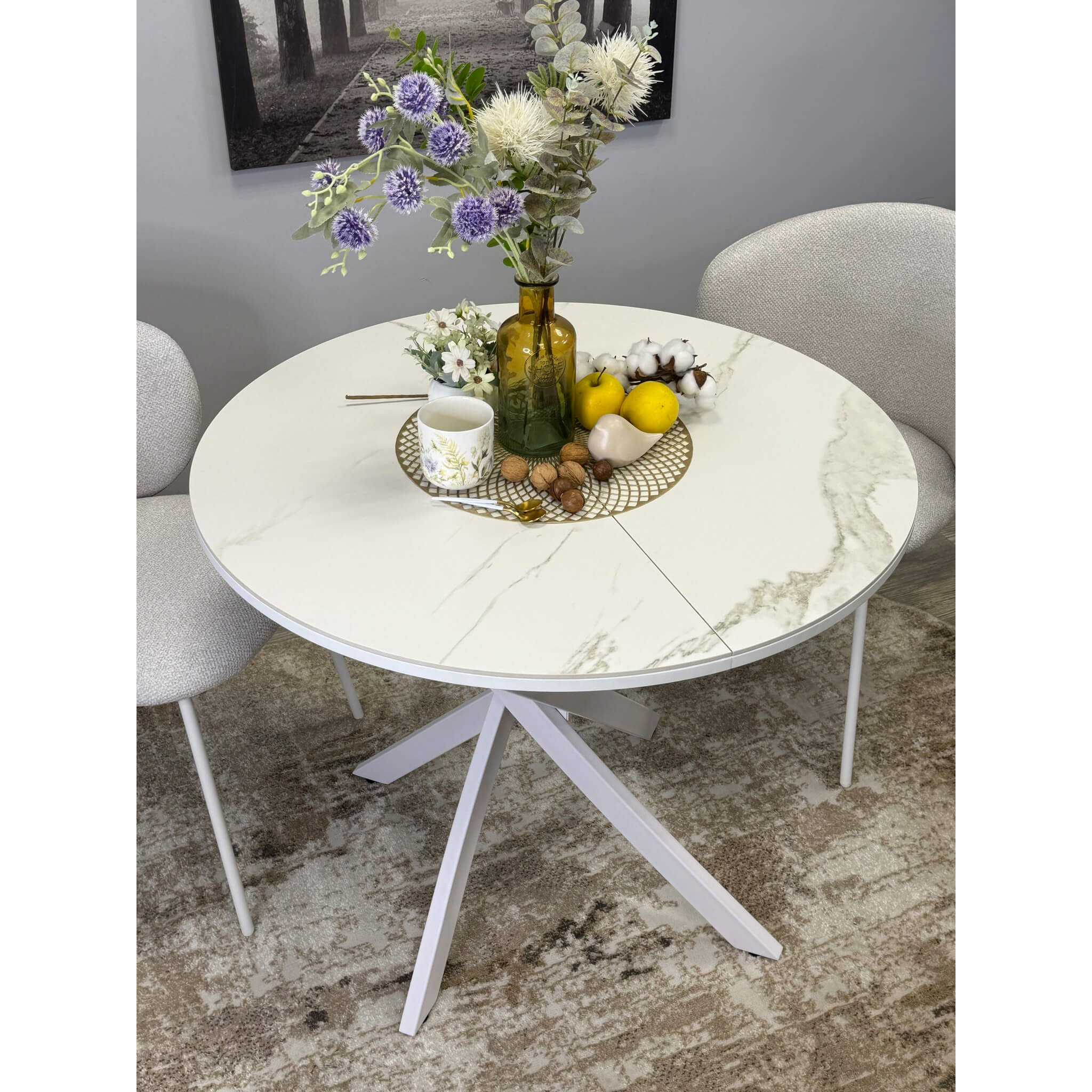 Ключевой особенностью этого стола является керамическая поверхность диаметром 90 см и долговечным, стабильным основанием. Дополняет комплект вставка на 30 см, расширяющая площадь стола.