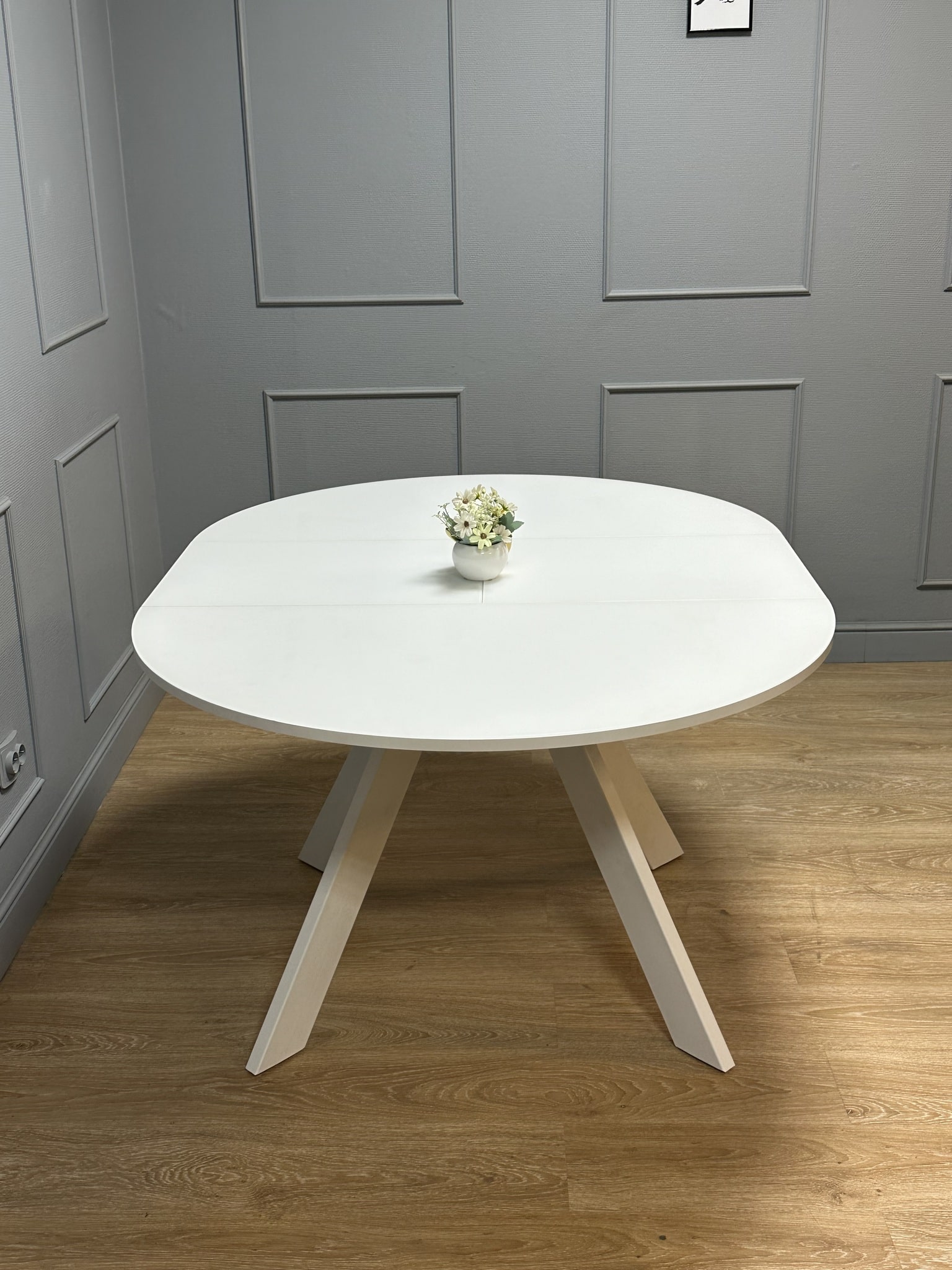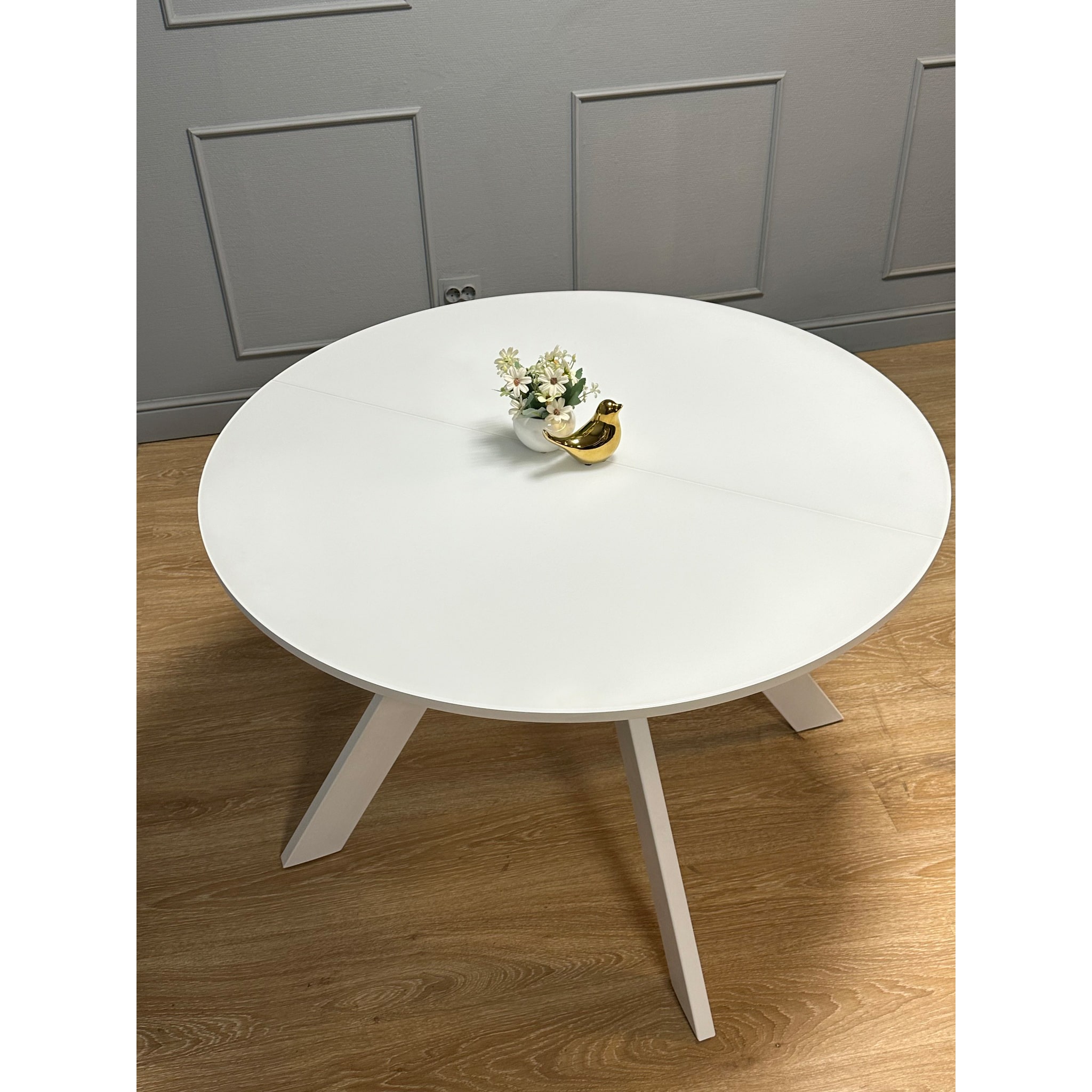 Круглый стол оптимального размера. Диаметр 1100мм позволяет и комфортное размещение 4 человек для постоянного использования и организацию места для гостей и при этом стол не занимает много места.