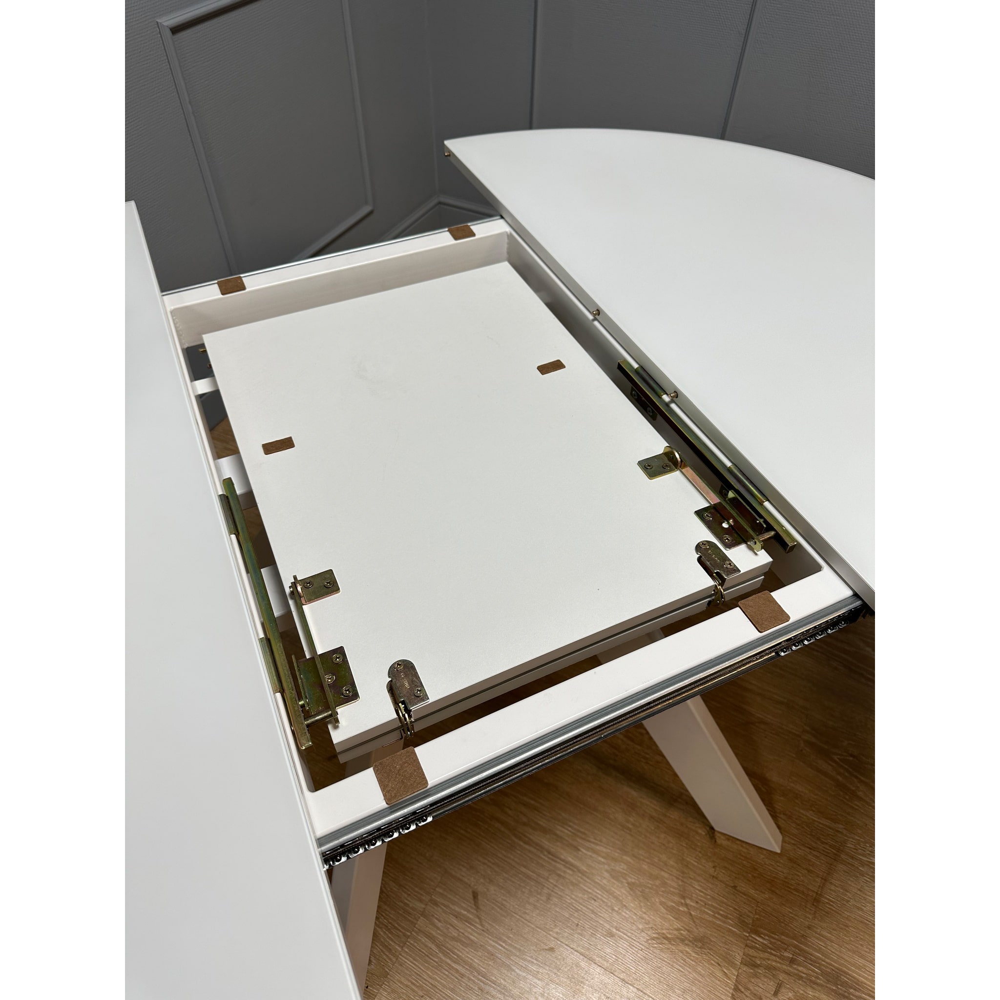 Оригинальные опоры из широкого профиля Итальянского типоразмера 90*30мм оставляют максимальное место для ног. Но главное скрыто под столешницей - это легкий и удообный механизм раскладки которые не заедает, не цепляет и достаточно большой для организации дополнительных мест для гостей.