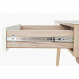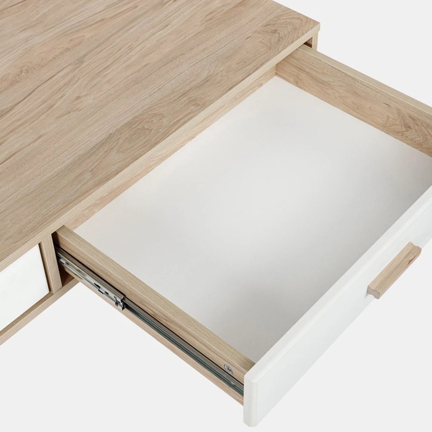 Столешница и корпус стола выполнены из ЛДСП под цвет натурального дуба, фасады ящиков - из МДФ, а ручки — из массива березы.