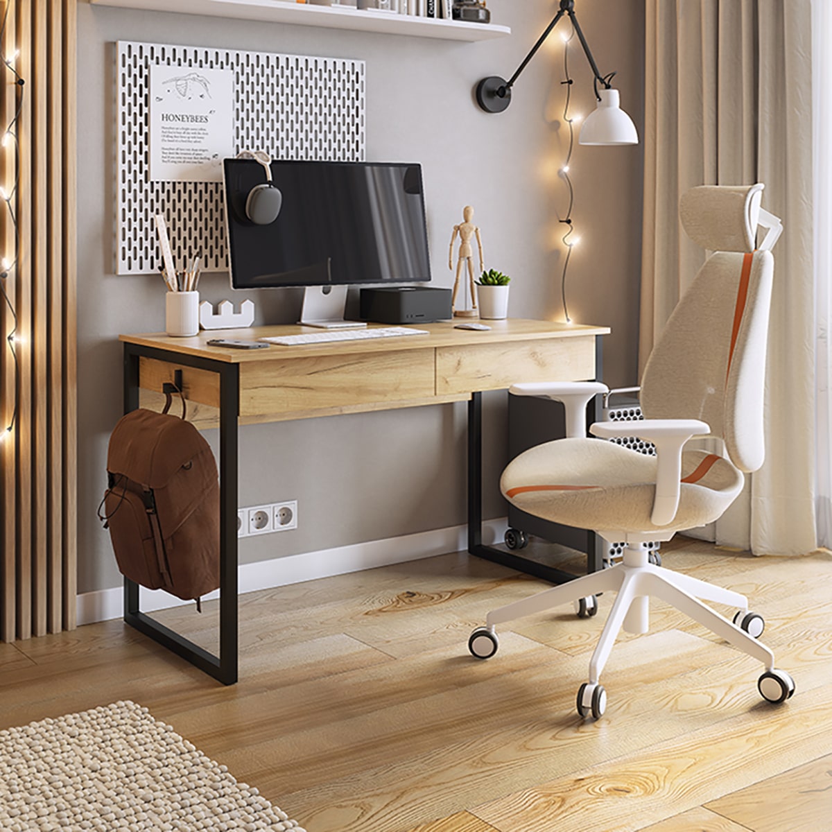 Стол на металлических опорах с двумя выкатными ящиками на шариковых направляющих, усиленный и надежный каркас, благодаря металлическому ребру жесткости под столешницей,будет стильным акцентов в комнате. Крючок на боковой стенке стола будет полезным дополнением для рюкзака или наушников.