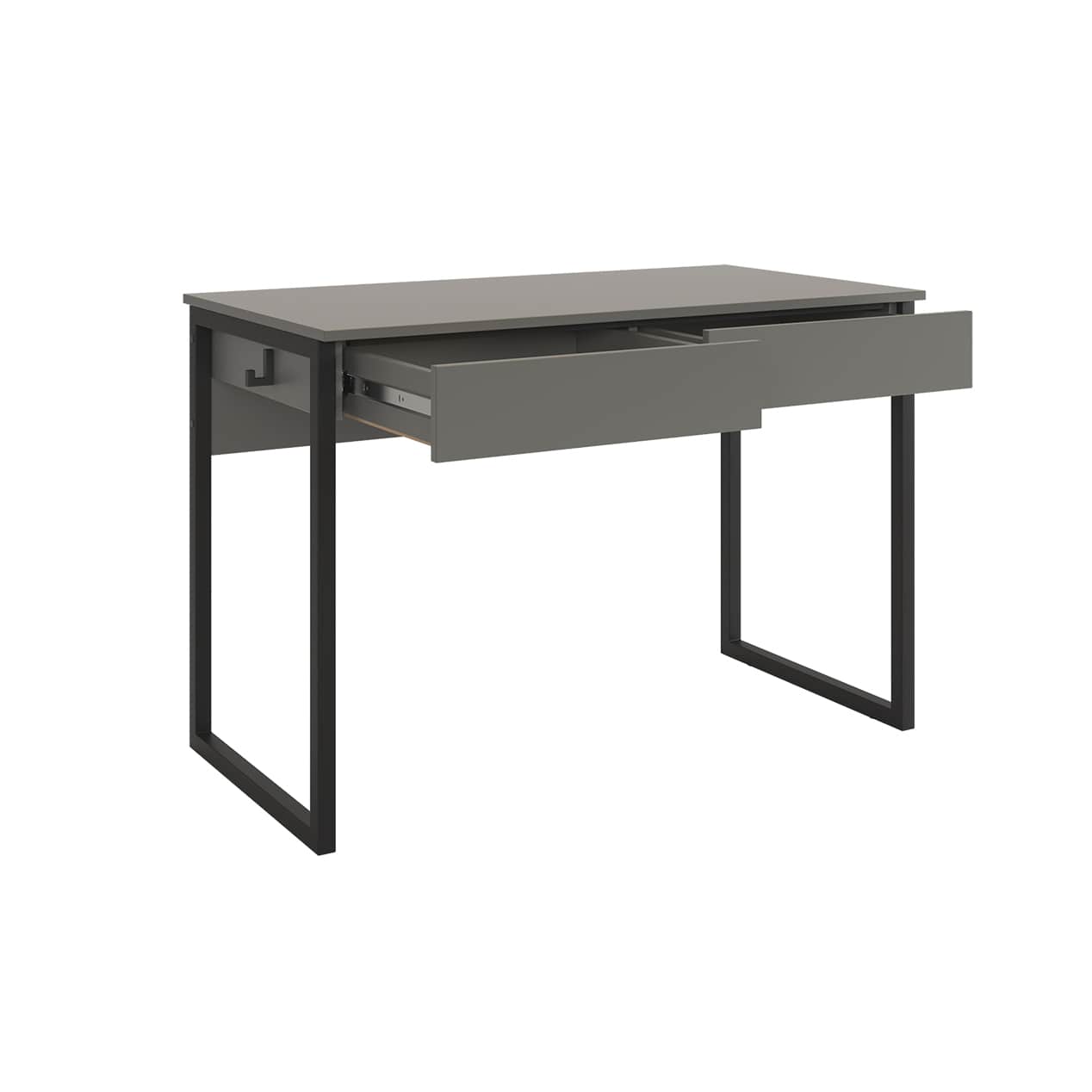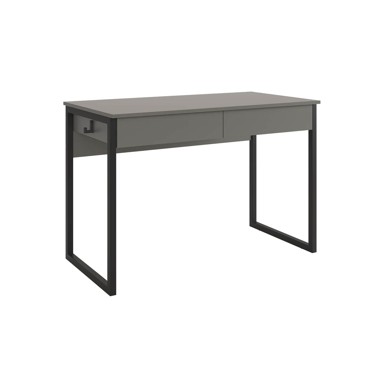 Стол на металлических опорах с двумя выкатными ящиками на шариковых направляющих, усиленный и надежный каркас, благодаря металлическому ребру жесткости под столешницей,будет стильным акцентов в комнате. Крючок на боковой стенке стола будет полезным дополнением для рюкзака или наушников.