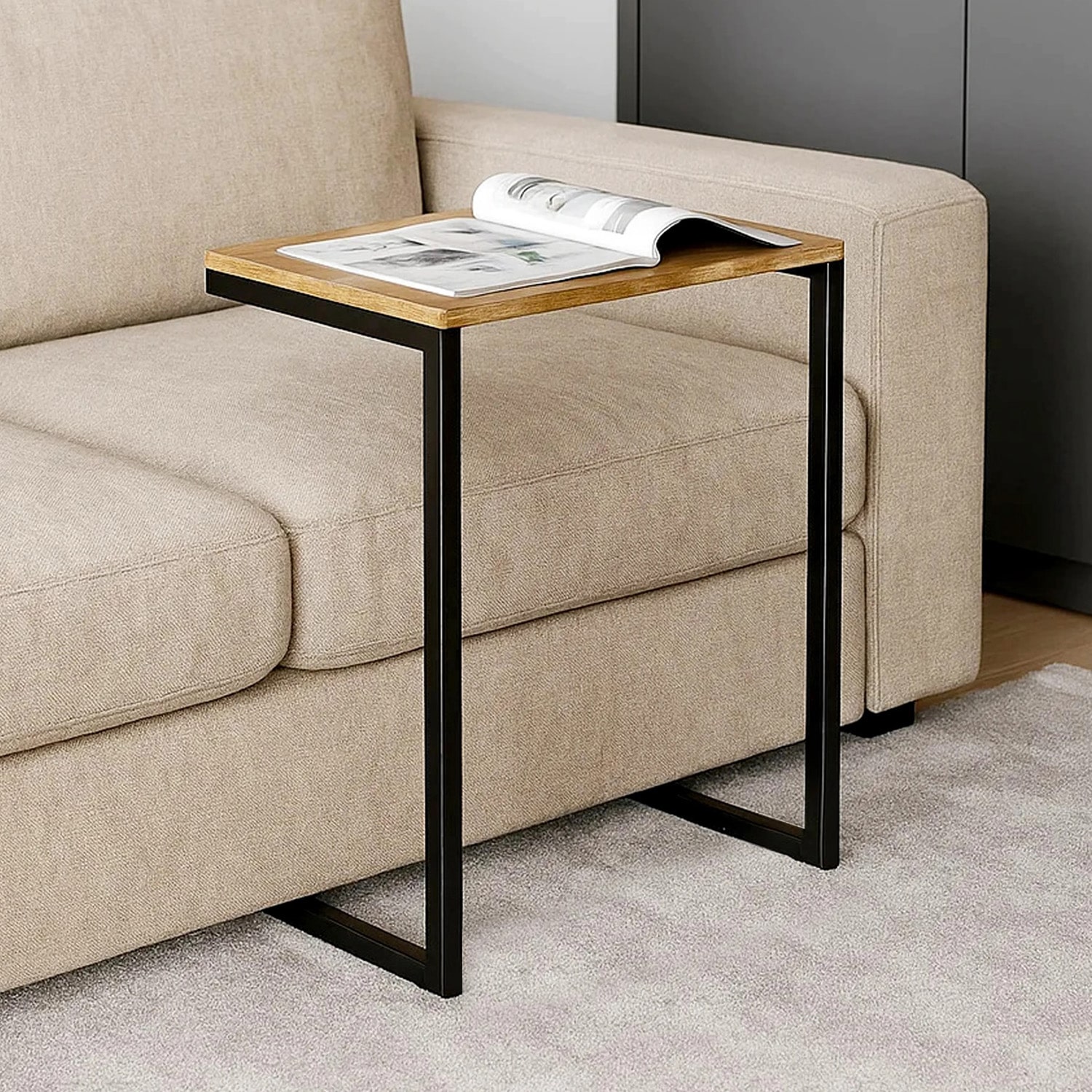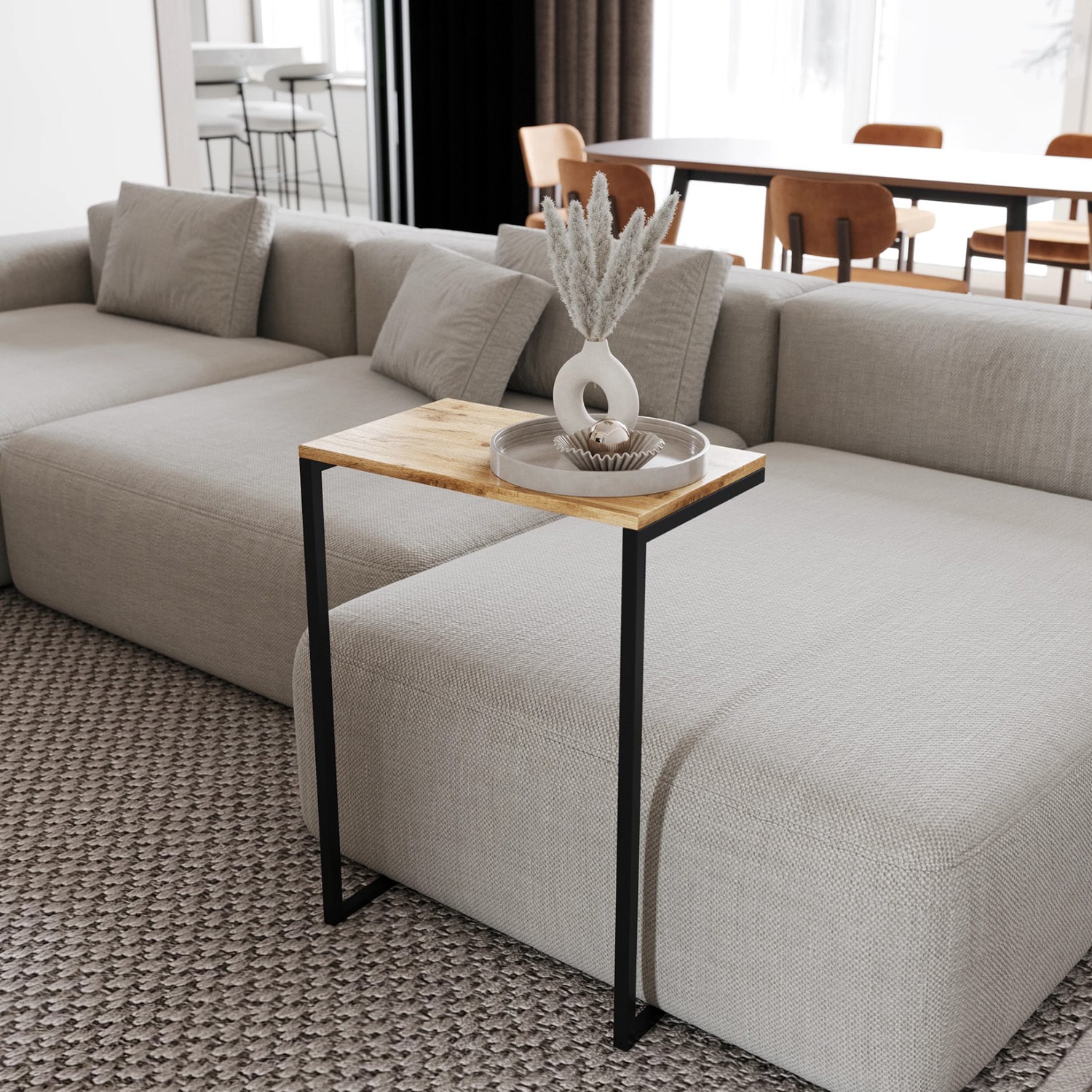 Стол с прямоугольной столешницей из ЛДСП, опорой для которой служит металлокаркас.