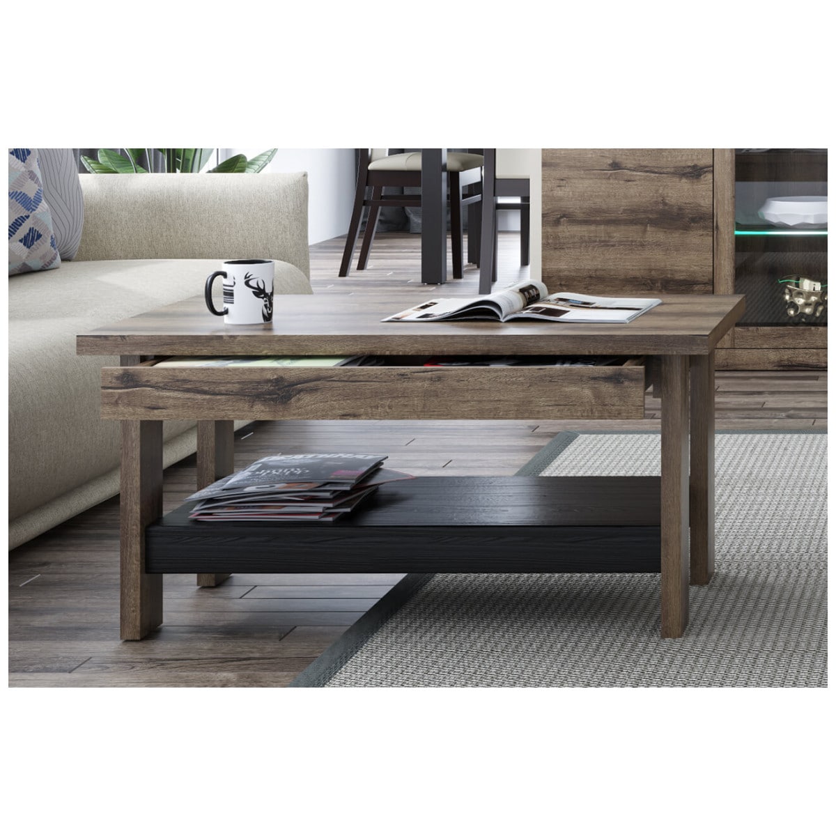 Стол журнальный JAGGER добавит в интерьер гостиной больше функциональности и притягательности. Конструкция элемента представляет собой столешницу прямоугольной формы, выдвижной ящик и сборную полку. Изделие устанавливается на четыре ножки-опоры.