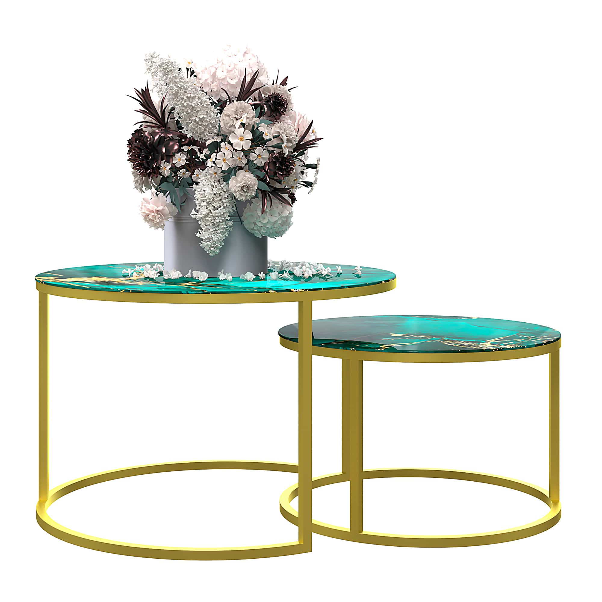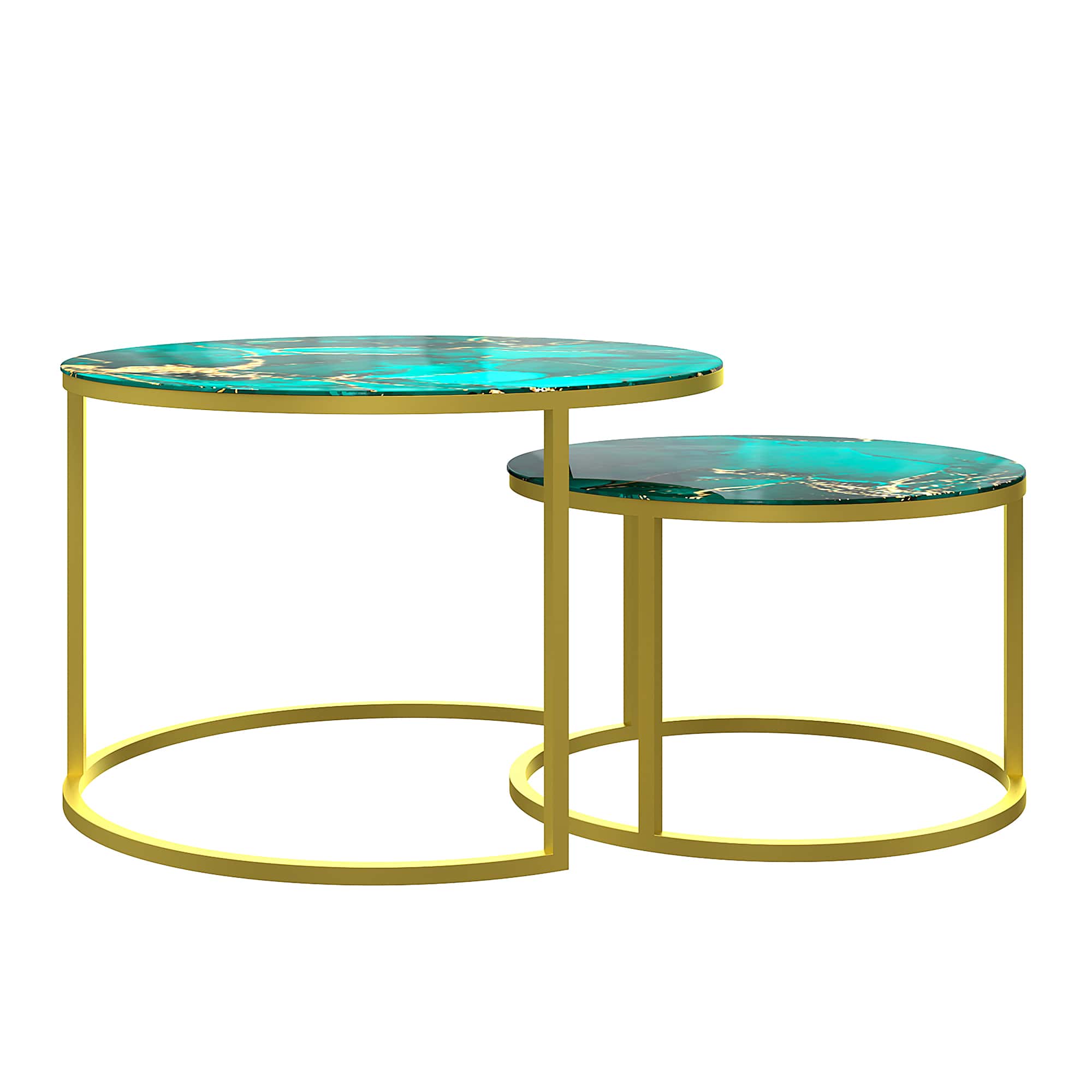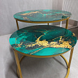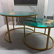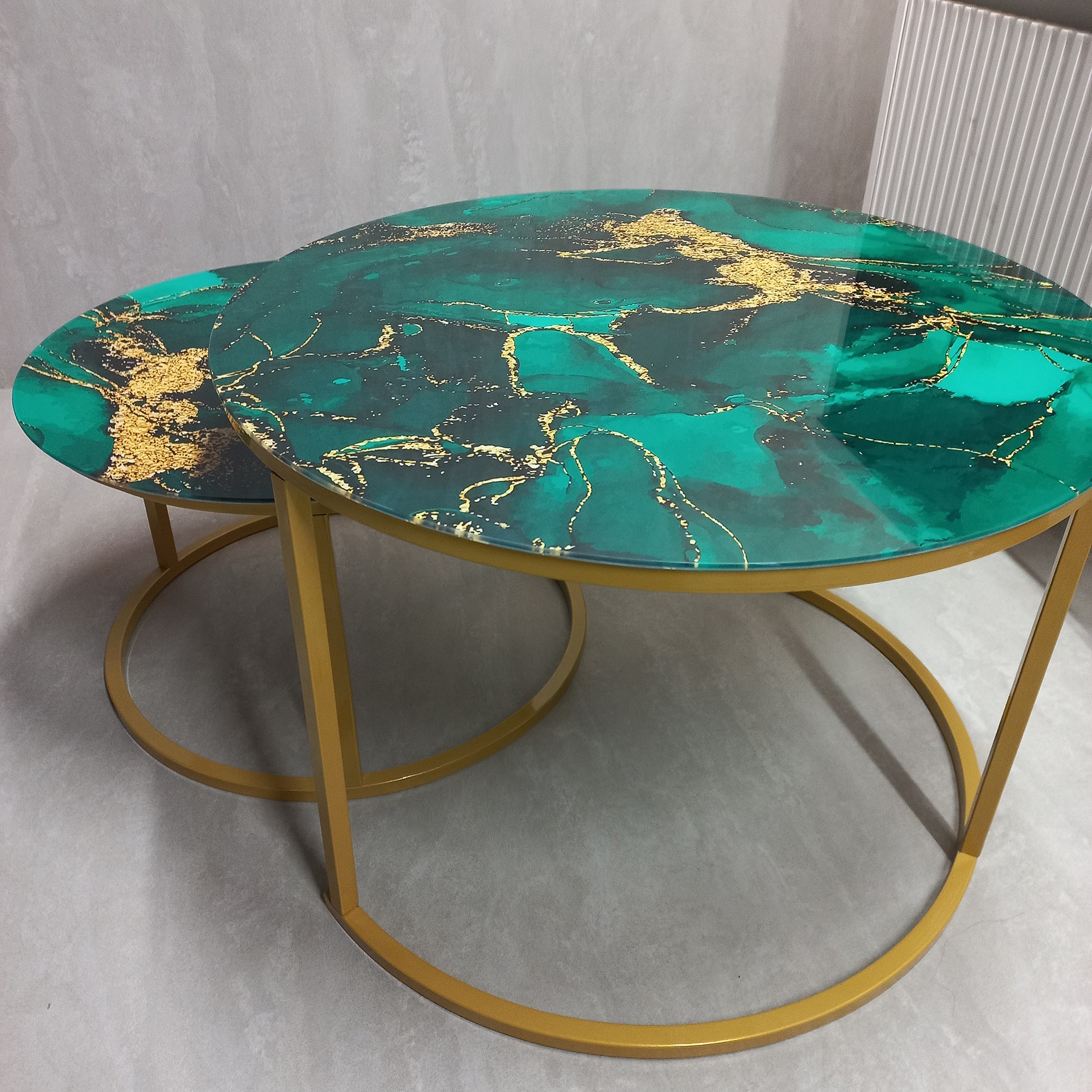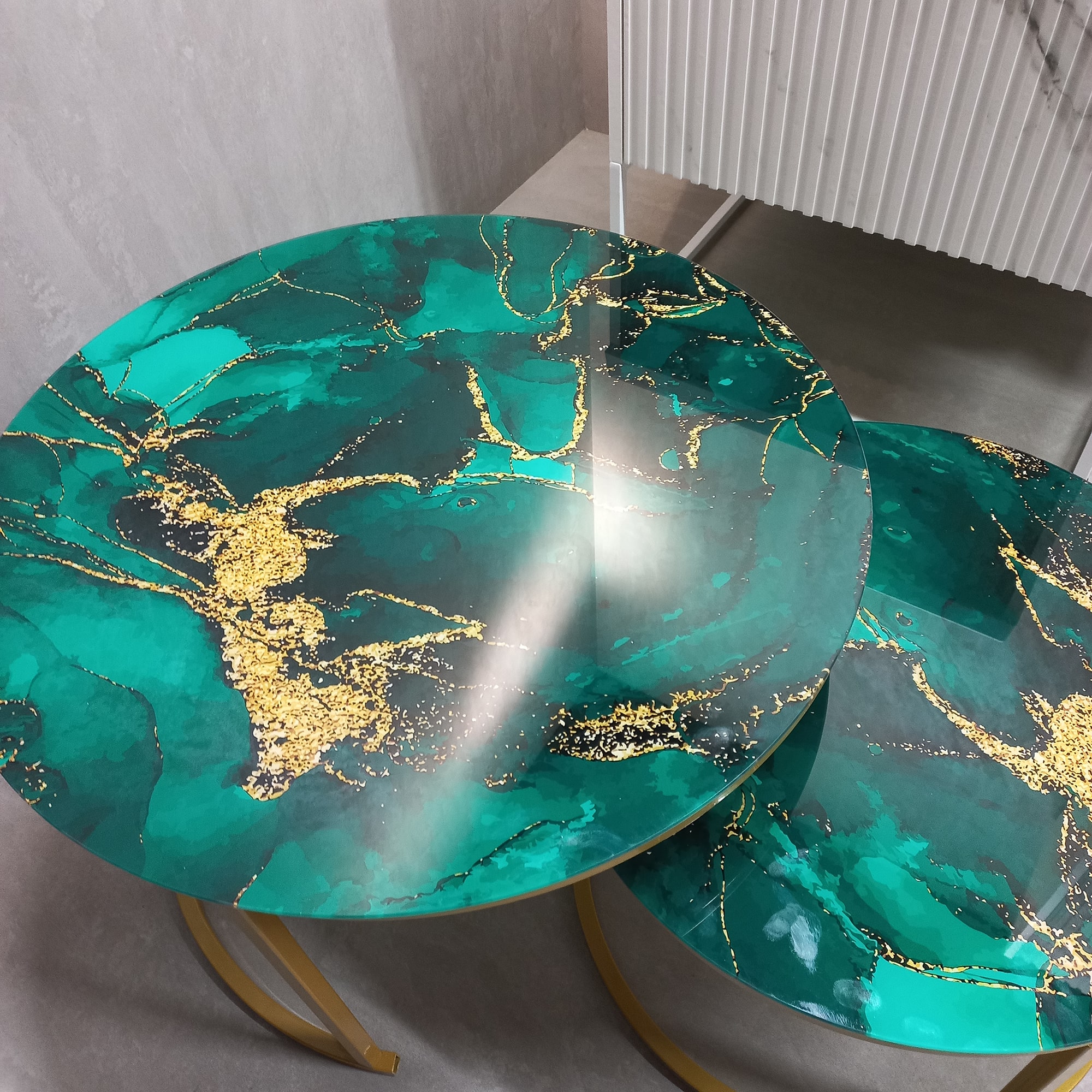 Диаметр большого 605, малого 475. Высота большого - 420 мм, высота малого - 320 мм. Металлический каркас - порошковое покрытие золотой муар, стекло с фотопечатью Малахит.
