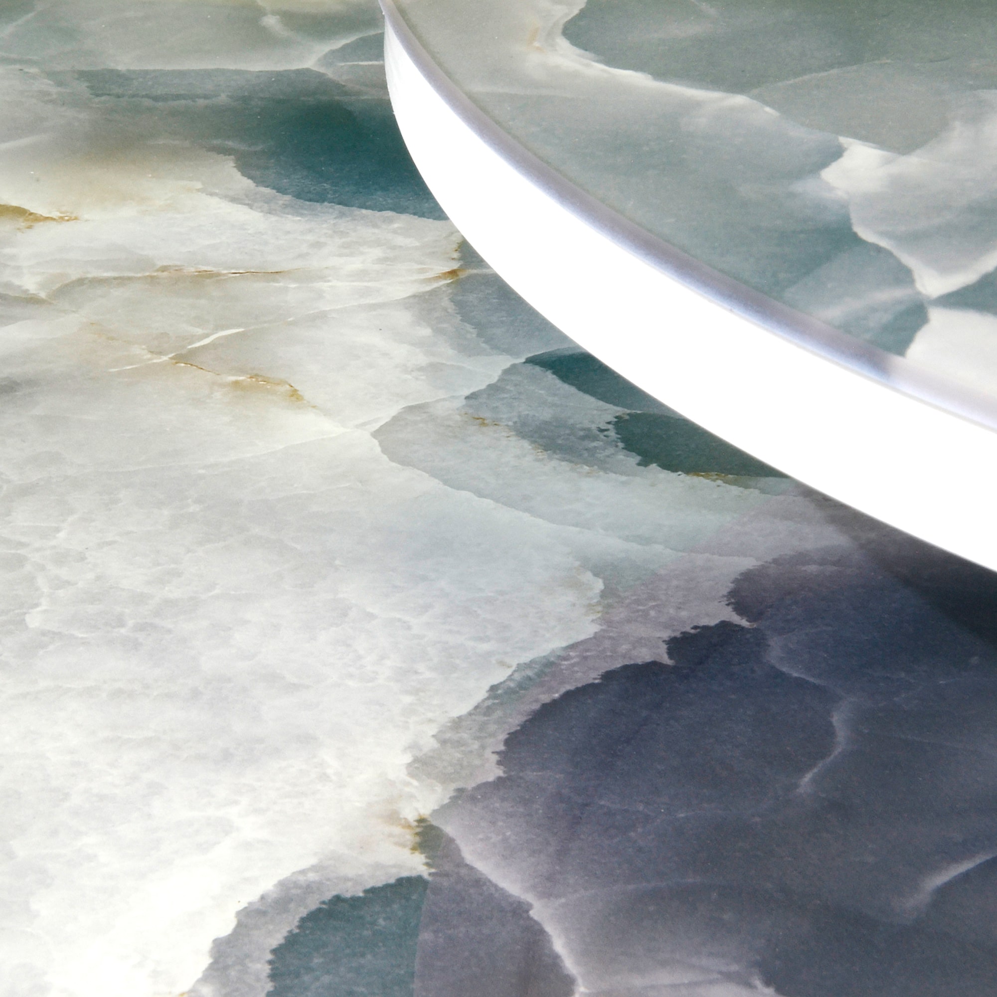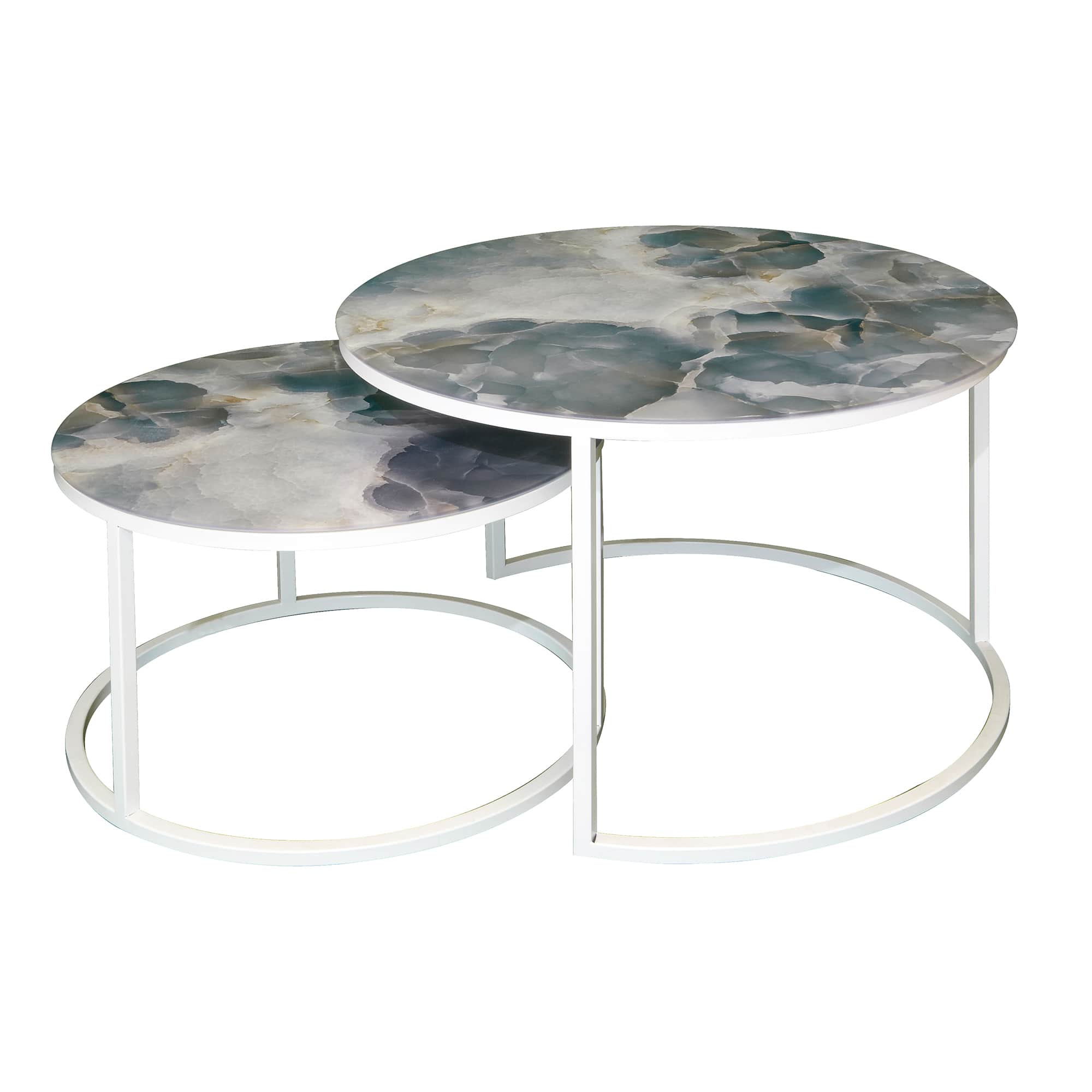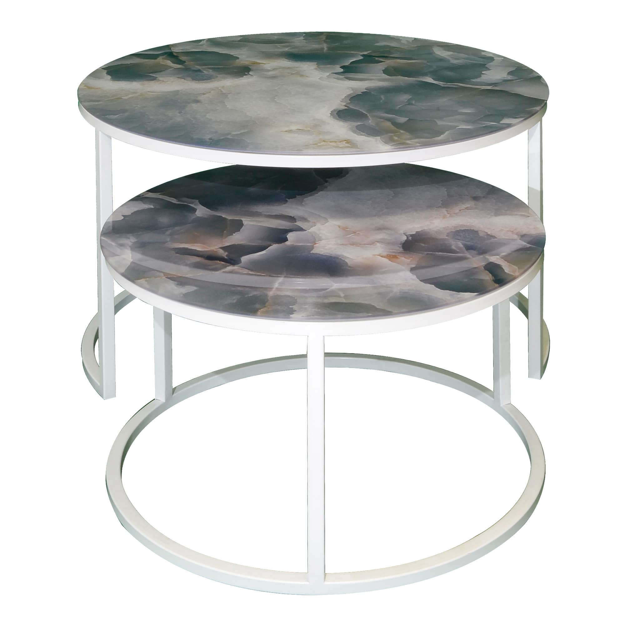 Диаметр большого 605, малого 475. Высота большого - 420 мм, высота малого - 320 мм. Металлический каркас - порошковое покрытие белый муар, стекло с фотопечатью серый мрамор.
