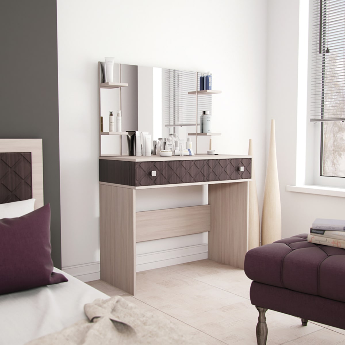 Столик туалетный "Николь" - это сочетание практичности и стиля. Он предназначен для хранения косметики и украшений в спальне, что делает его незаменимым предметом интерьера.