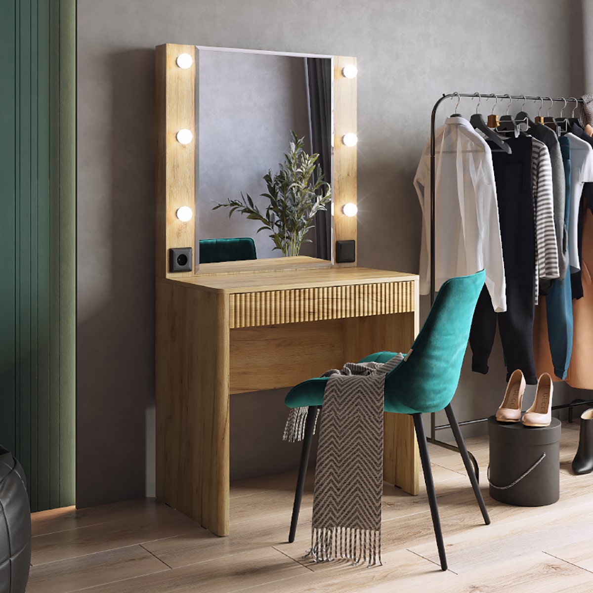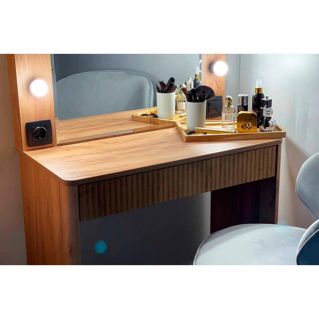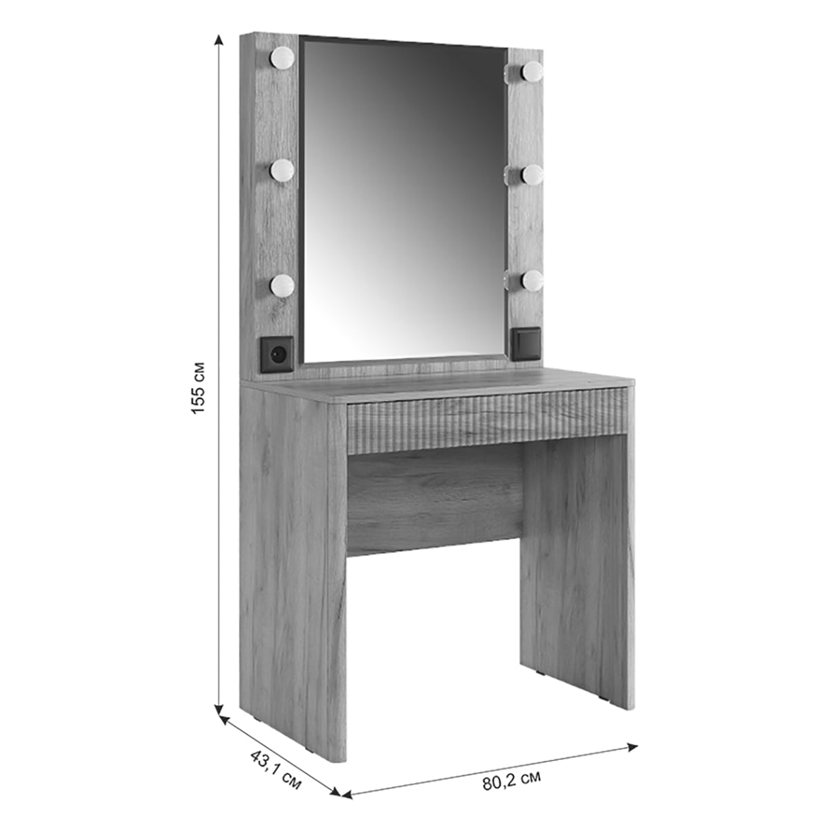 Туалетный столик Адам — это идеальное сочетание стиля и практичности. С широким фацетированным зеркалом, в котором встроена подсветка из 6 лампочек, оно создает атмосферу профессиональных студий визажистов прямо у вас дома. Комфорт и функциональность обеспечиваются дополнительными элементами, такими как выключатель, розетка для фена и выдвижной ящик для хранения украшений и косметики. Элегантные закругленные углы завершают дизайн, делая его идеальным дополнением к вашей спальне.
