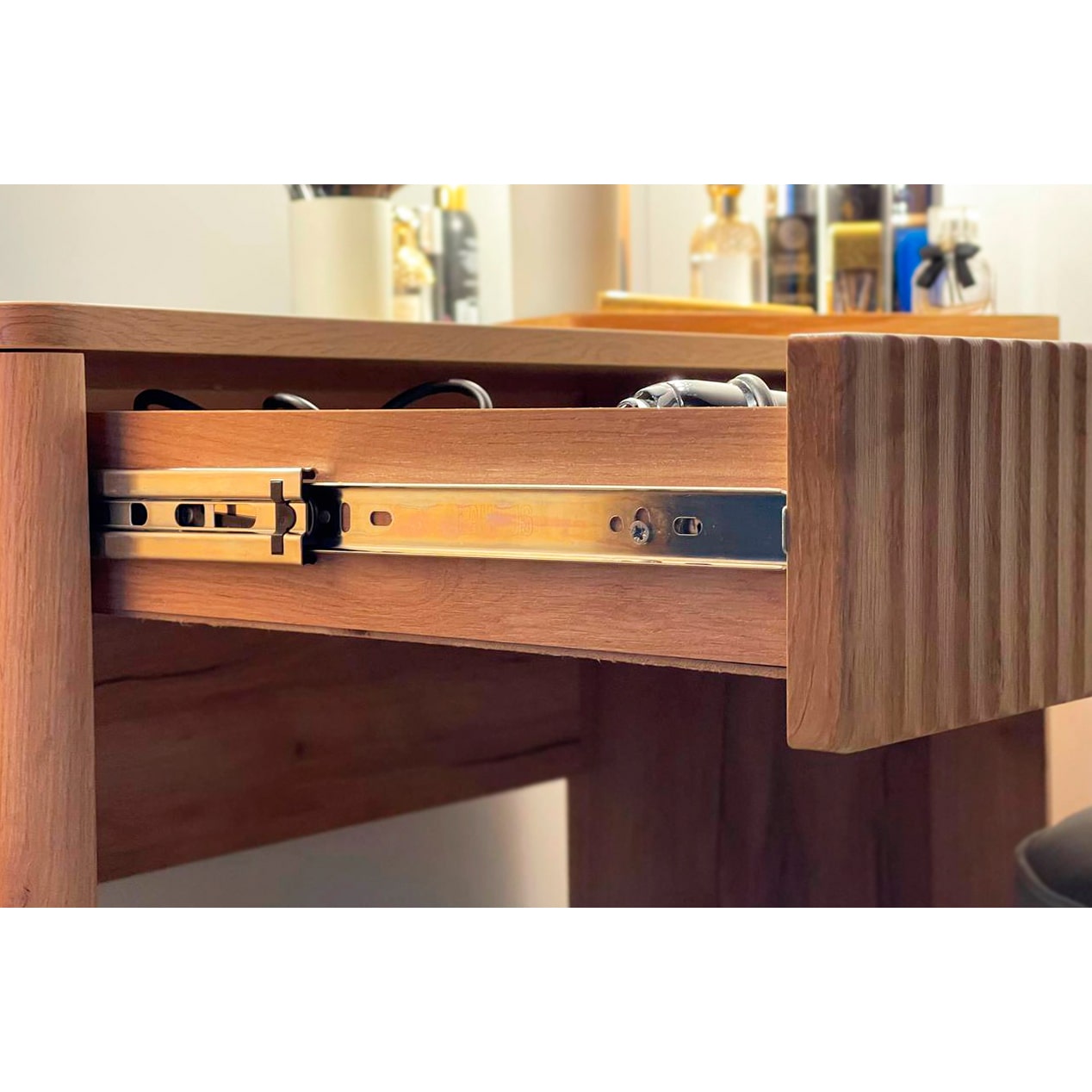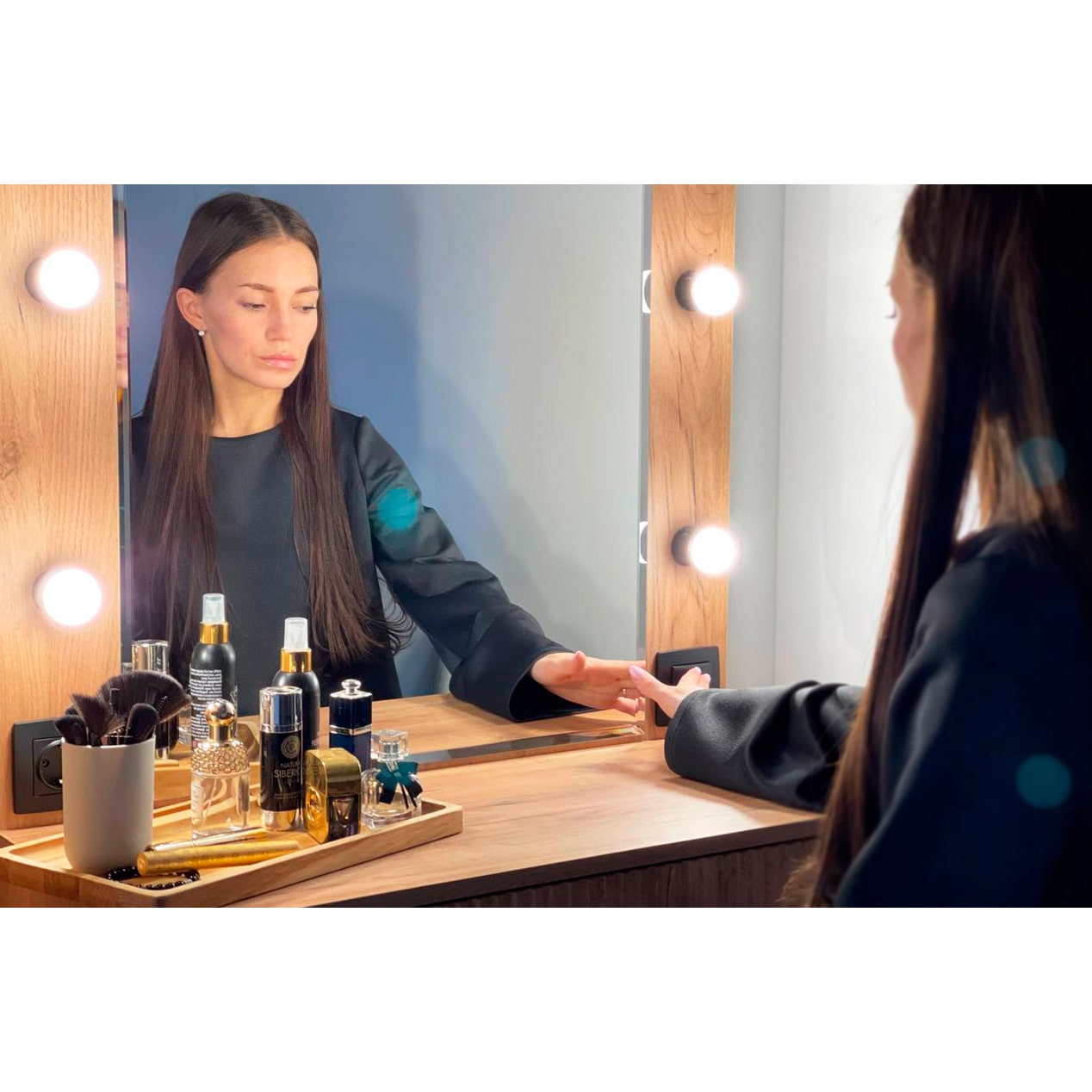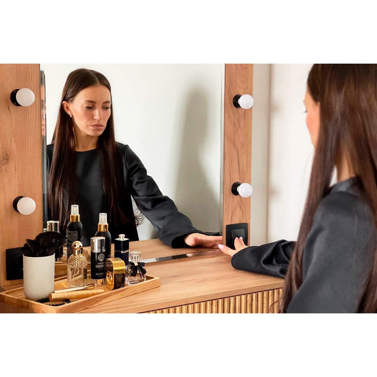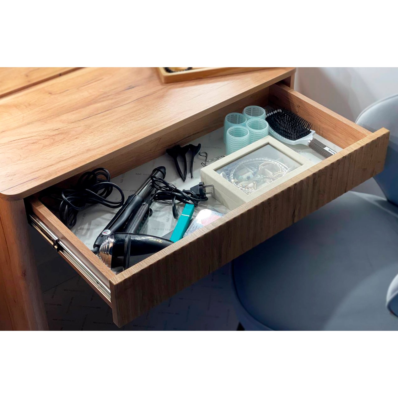 Туалетный столик Адам — это идеальное сочетание стиля и практичности. С широким фацетированным зеркалом, в котором встроена подсветка из 6 лампочек, оно создает атмосферу профессиональных студий визажистов прямо у вас дома. Комфорт и функциональность обеспечиваются дополнительными элементами, такими как выключатель, розетка для фена и выдвижной ящик для хранения украшений и косметики. Элегантные закругленные углы завершают дизайн, делая его идеальным дополнением к вашей спальне.
