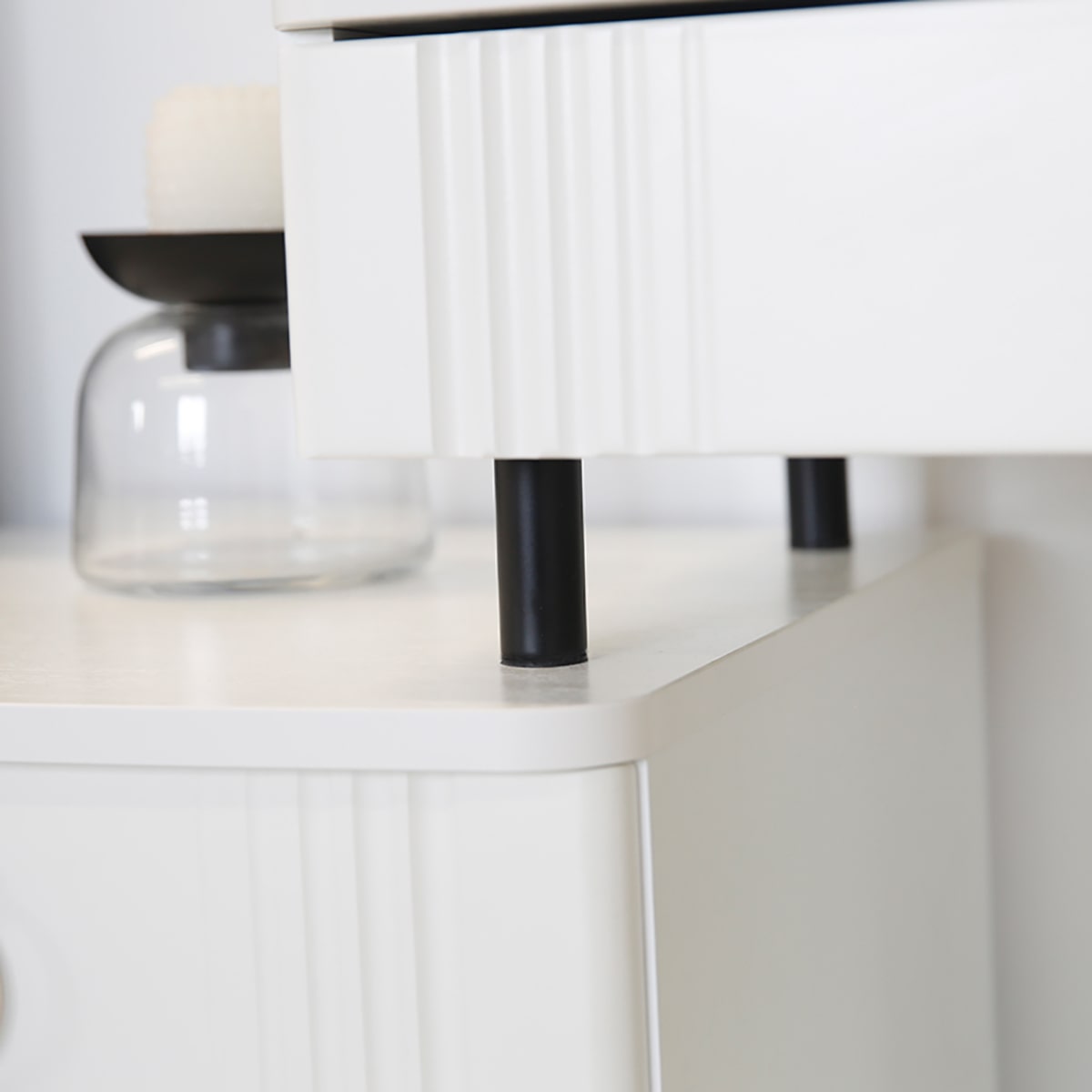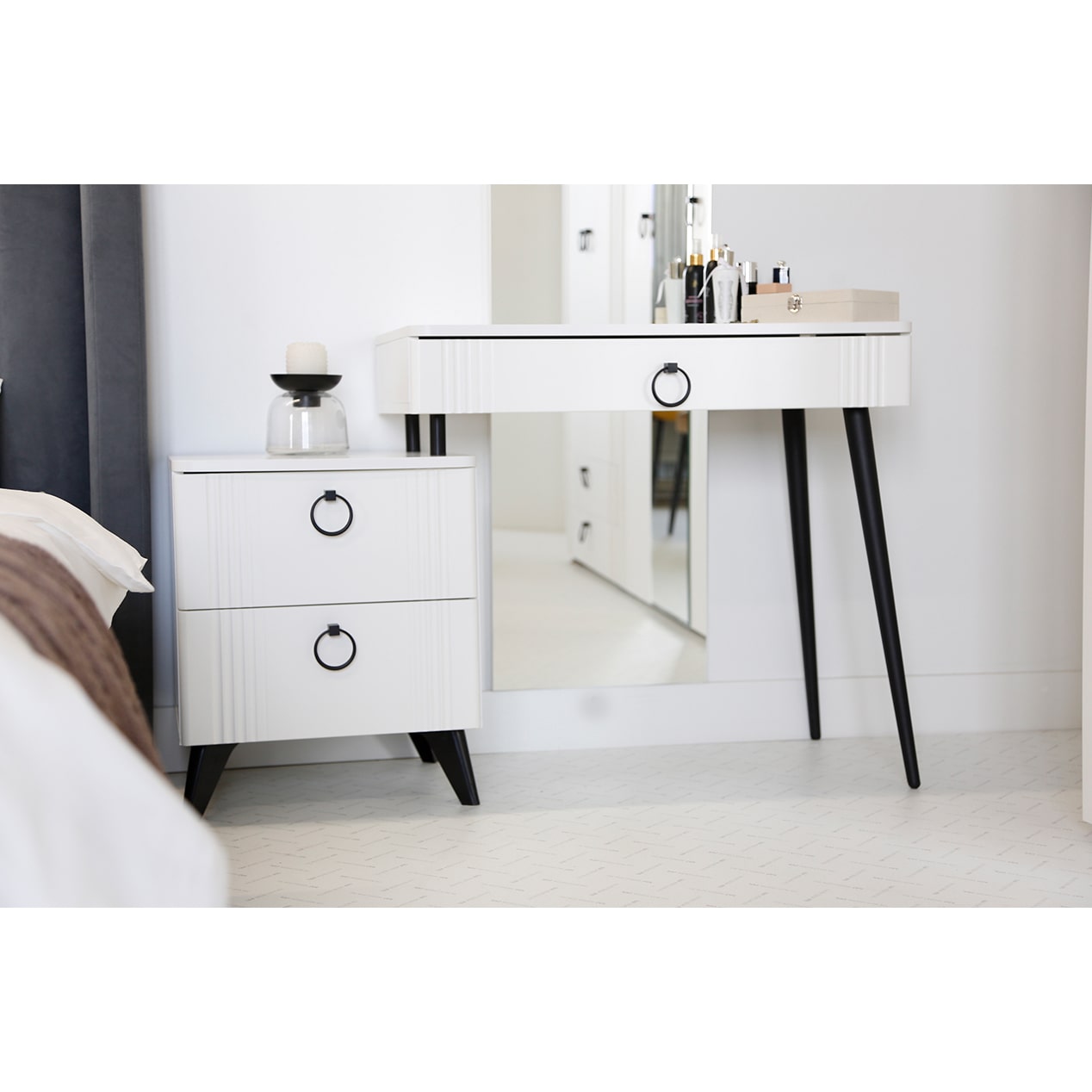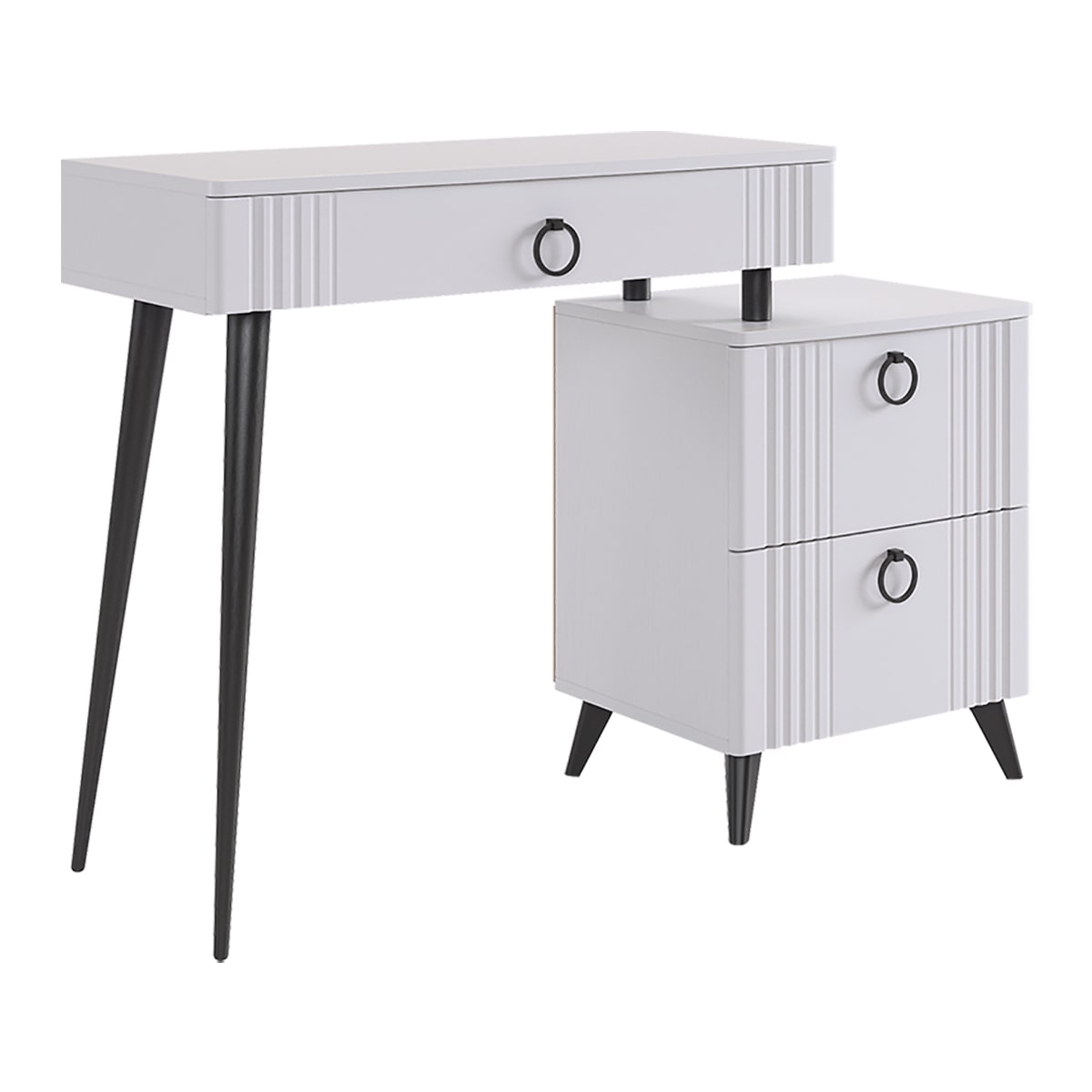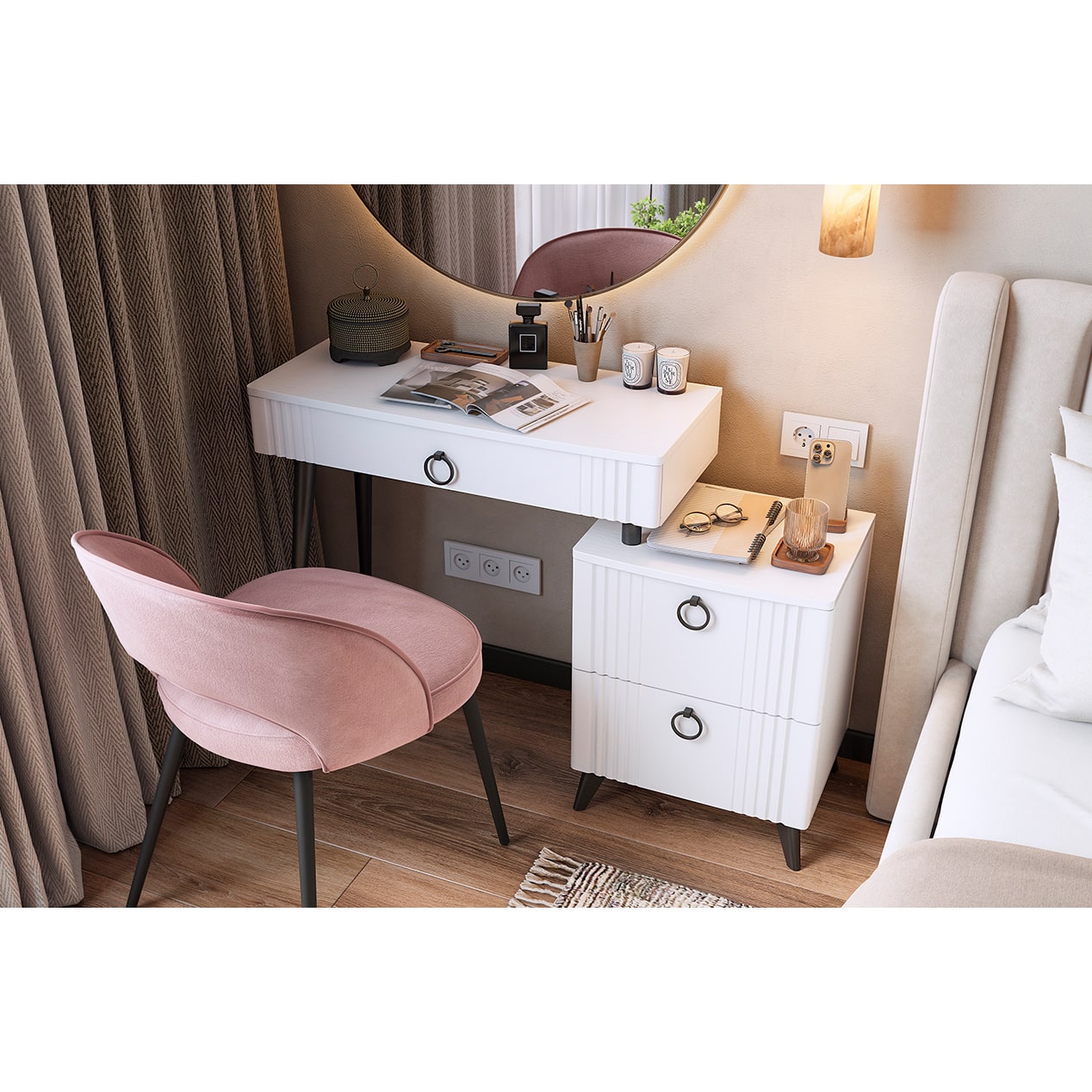 Цветовое сочетание белого корпуса из ЛДСП и фасада из МДФ облицованного пленкой ПВХ создает свежий и модный образ мебели. Необычная фрезеровка фасада добавляет изысканности и утонченности этому туалетному столику.