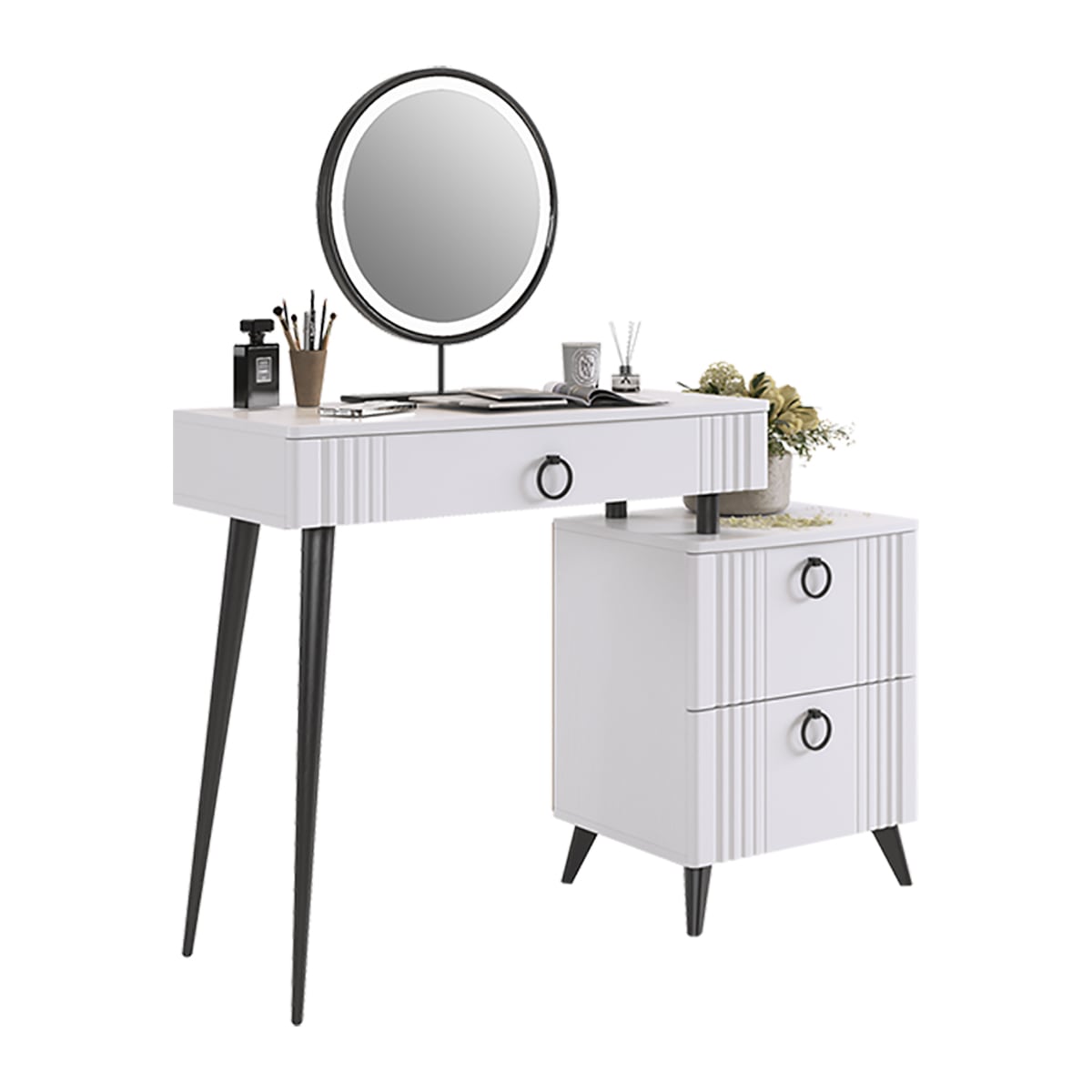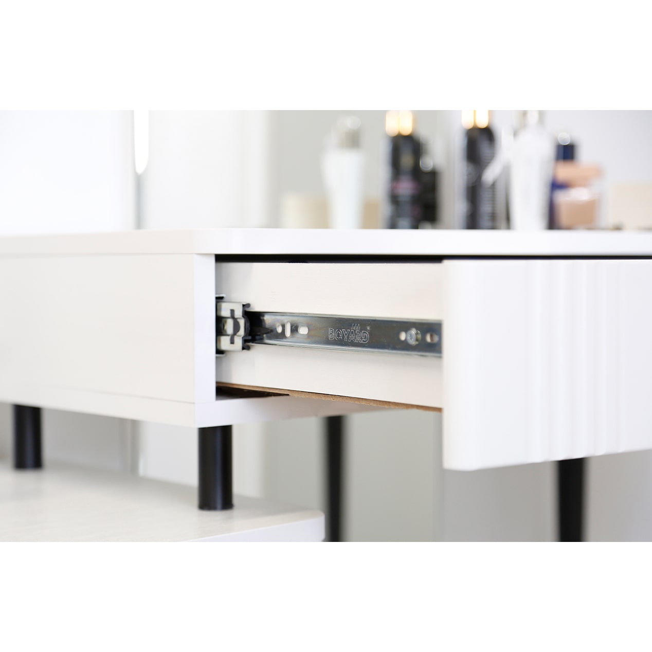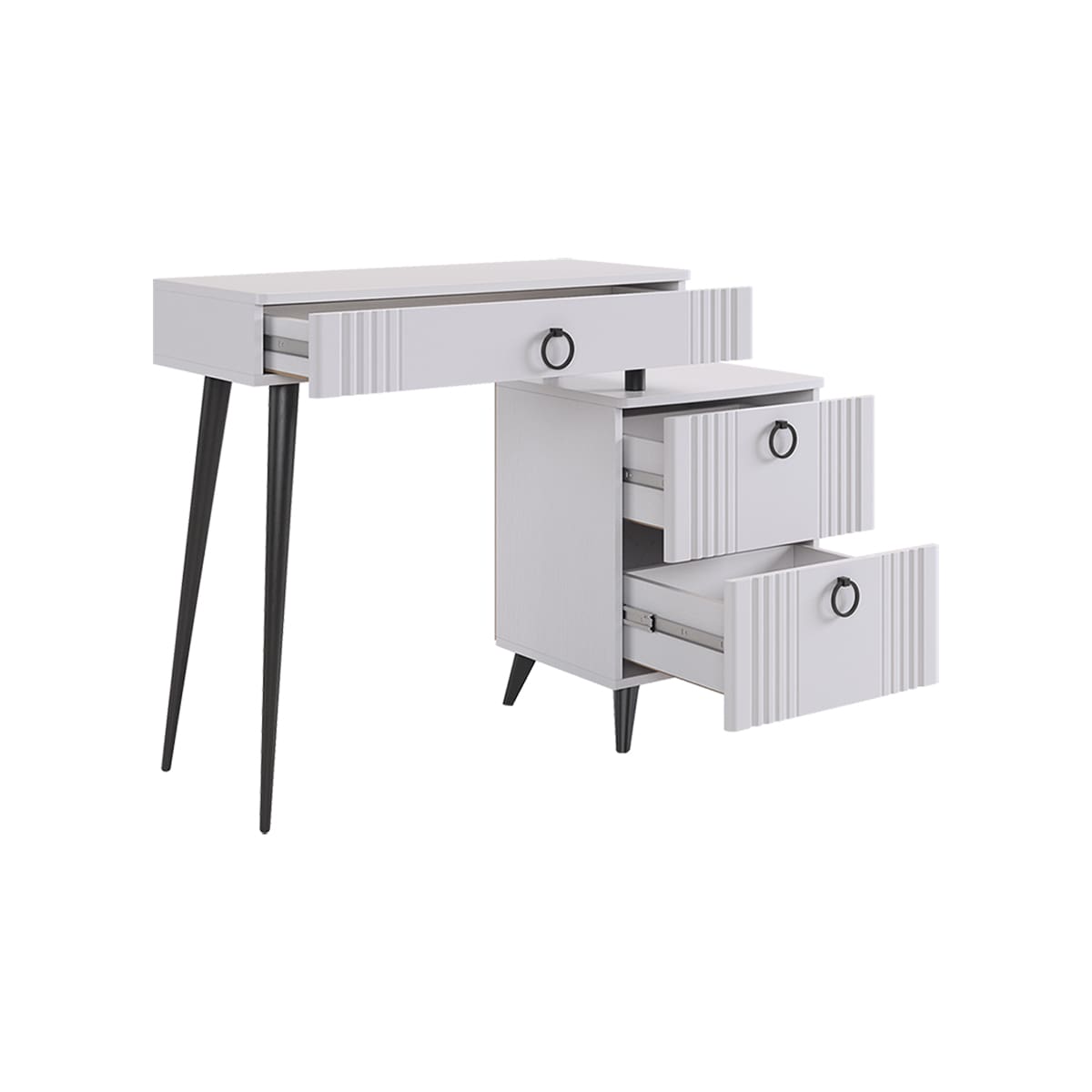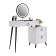 Туалетный столик "Ева" прекрасно впишется в интерьер спальни или ванной комнаты благодаря своему стильному дизайну и функциональности. Вместительные выкатные ящики обеспечат удобное хранение косметики, украшений и других мелочей. Шариковые направляющие гарантируют легкость открывания и закрывания ящиков, а металлические ручки добавляют стильный акцент. Высокие черные опоры придают столику устойчивость и элегантность.