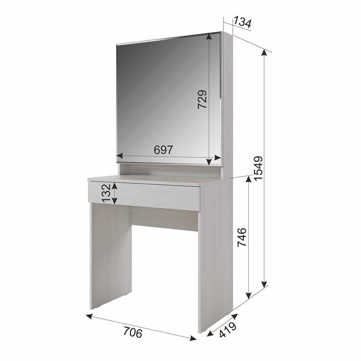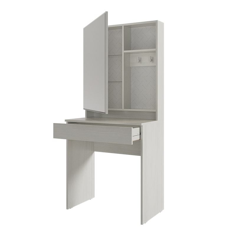 Туалетный столик Аурика станет незаменимым атрибутом вашей спальни или гардеробной. Эта модель идеально сочетает в себе практичность и стиль. За его зеркалом расположены стеклянные полки, которые станут идеальным местом для хранения всех ваших косметических средств и аксессуаров. Крючки предлагают дополнительное пространство для украшений или фена. Фацет на кромке зеркала добавляет изящество, преломляя свет и визуально расширяя пространство комнаты.