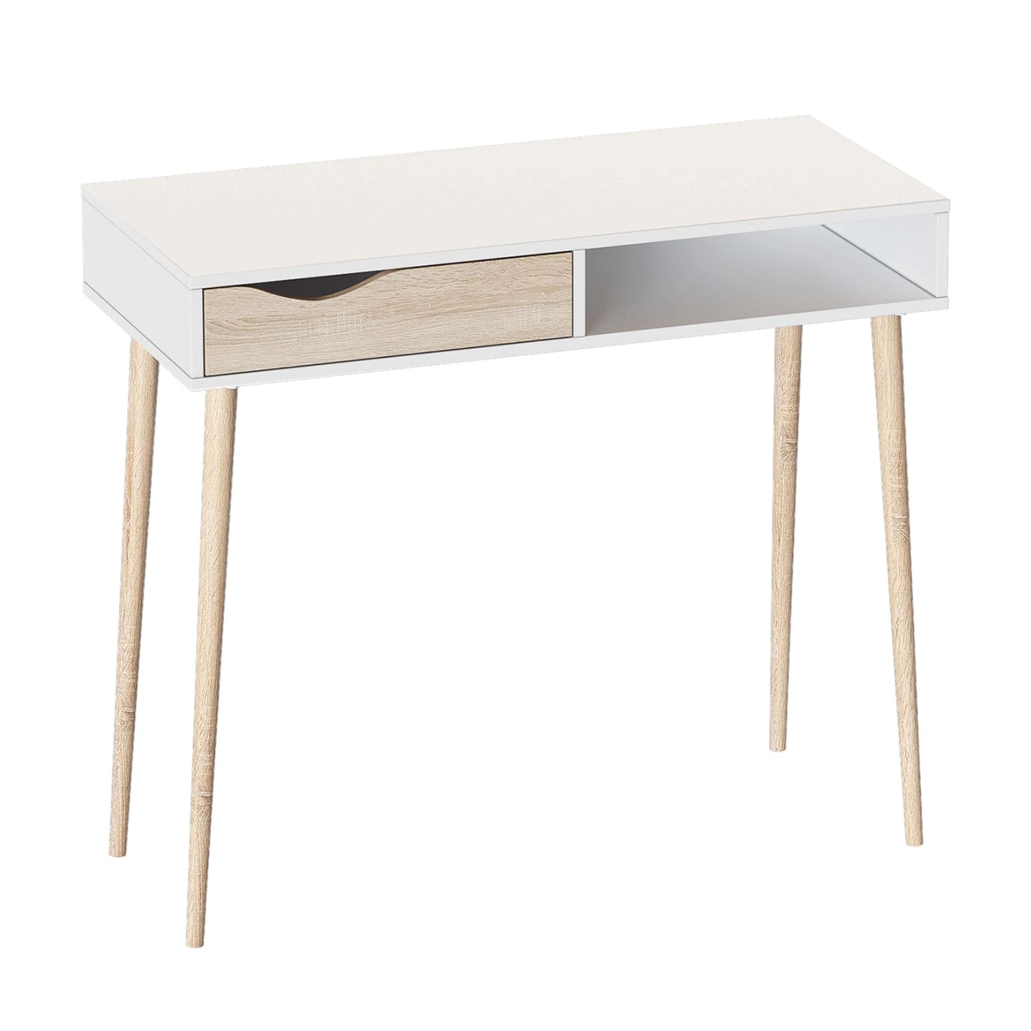 Серия «Соната» проста и натуральна, выполнена в природных оттенках. Дизайн стола перекликается со скандинавским стилем: чистые линии, белые фасады и элегантные опоры из массива берёзы.