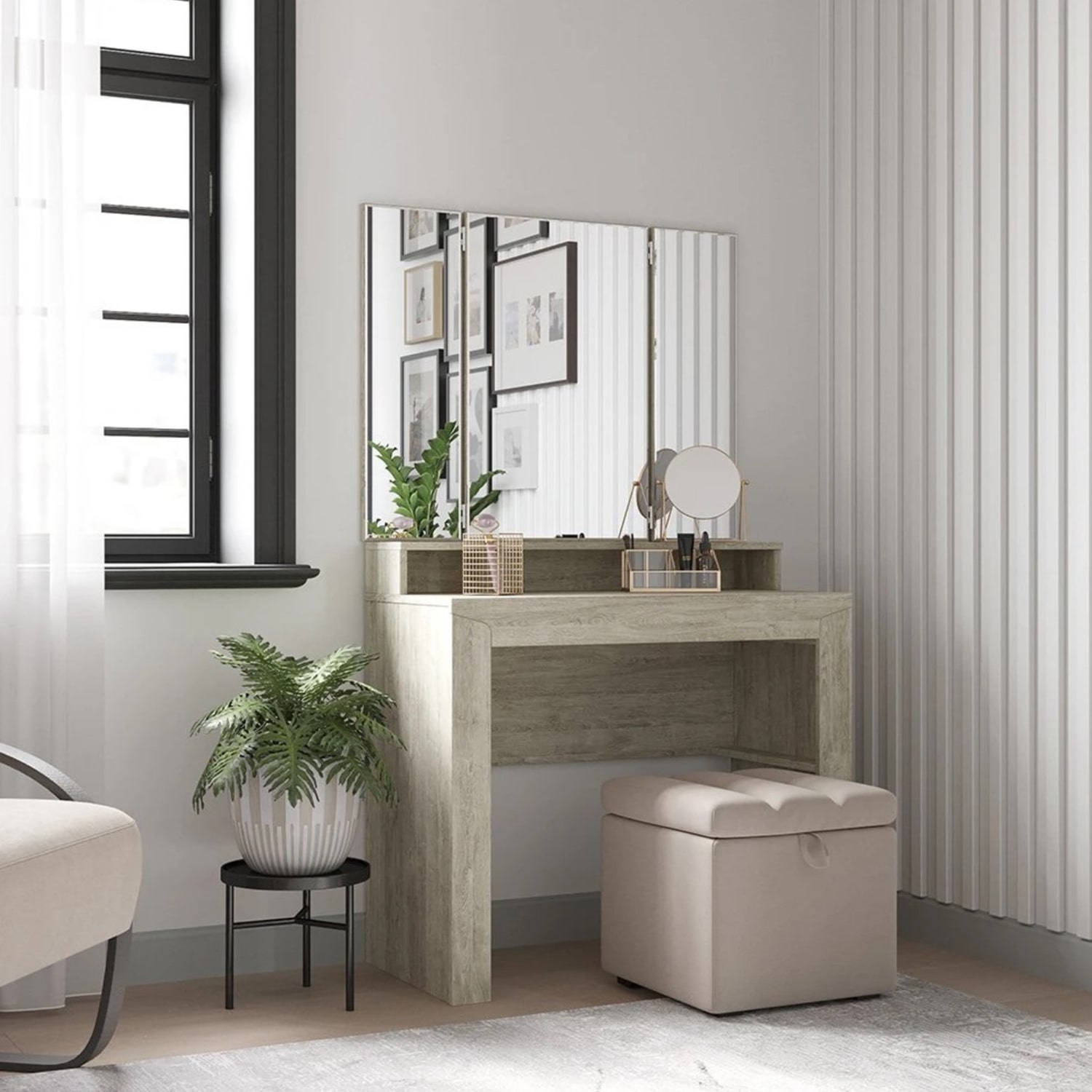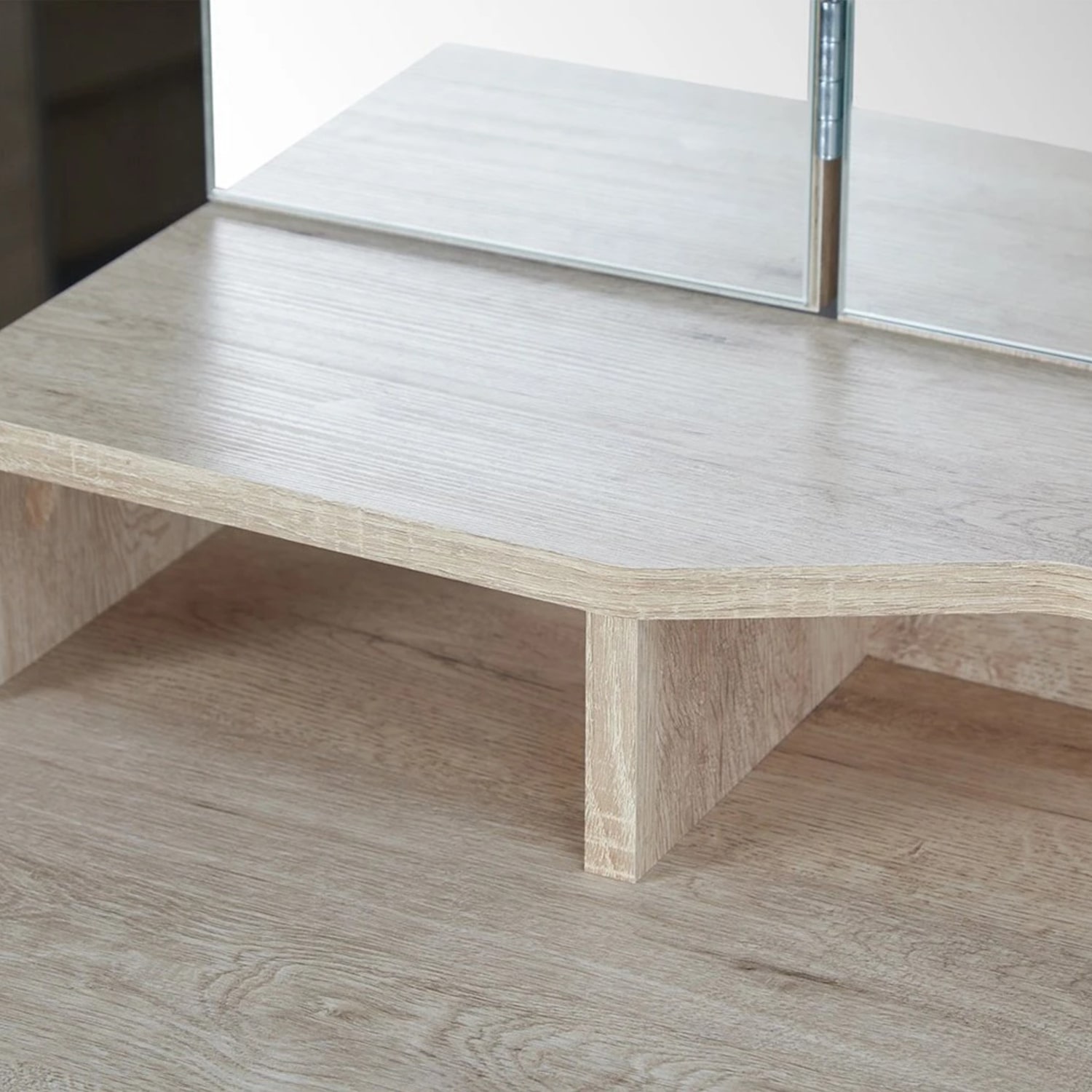 Туалетный столик имеет удобную рабочую поверхность с дополнительной надстройкой, он также оснащён вместительным выдвижным ящиком для хранения косметики, украшений, аксессуаров и других важных мелочей.