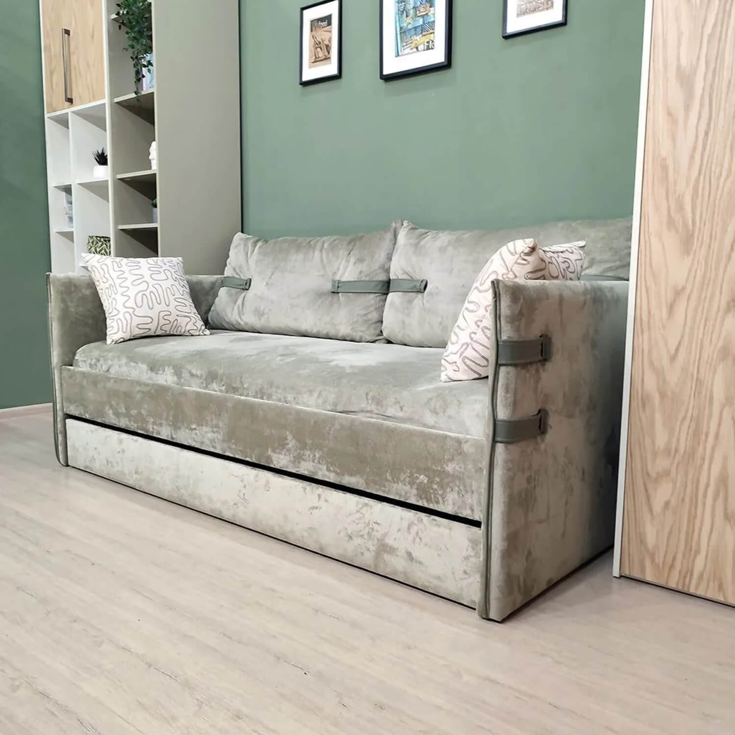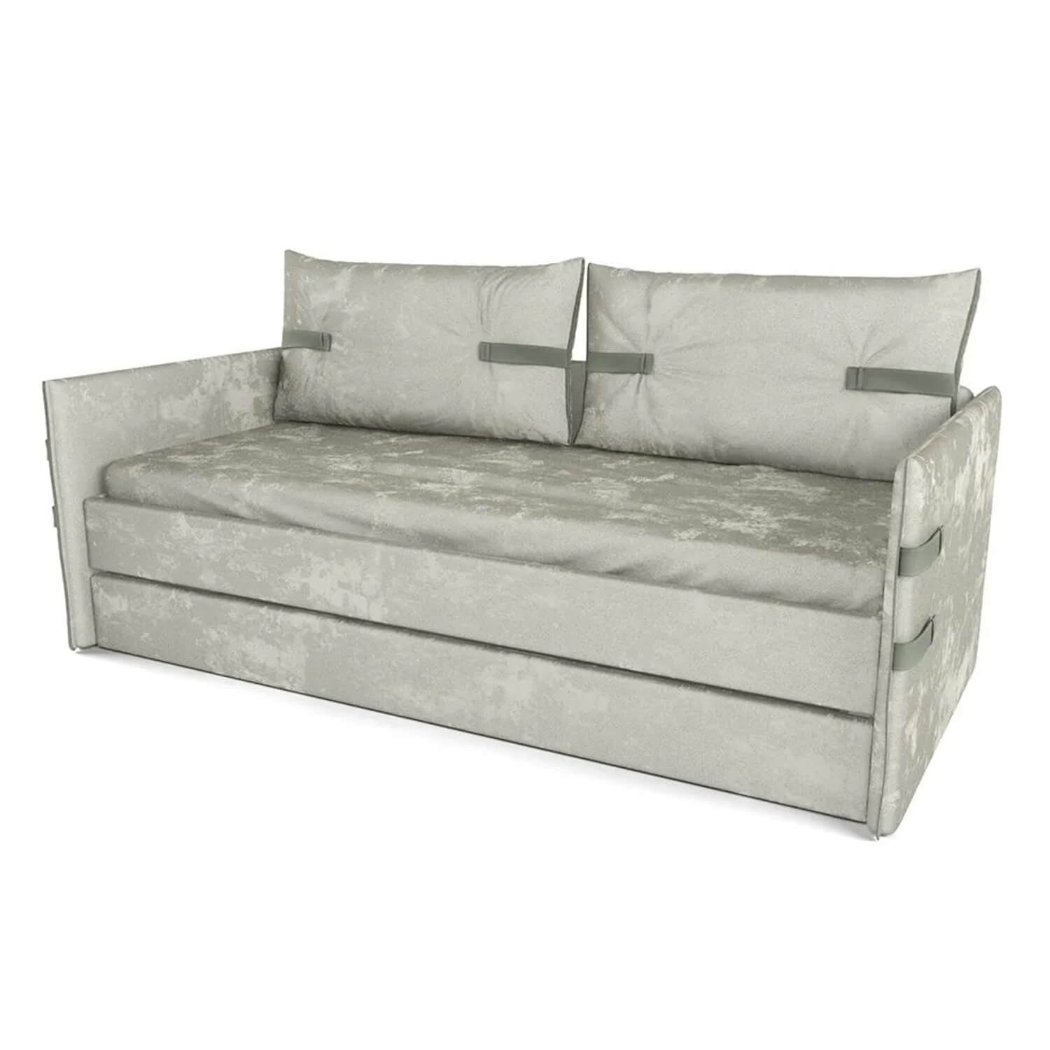 Ремешки из искусственной кожи и кант по бокам подушек повторяют дизайн мягкой кровати Тури.