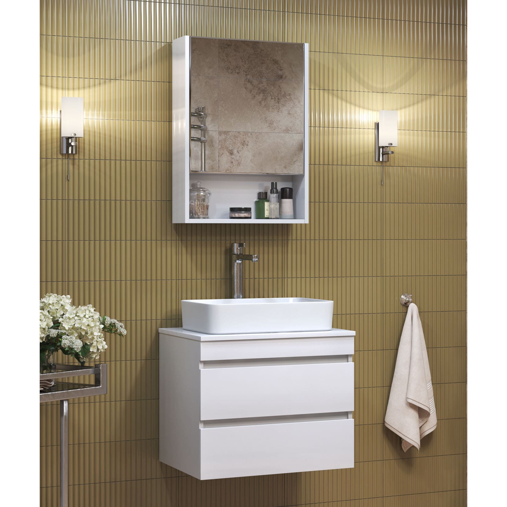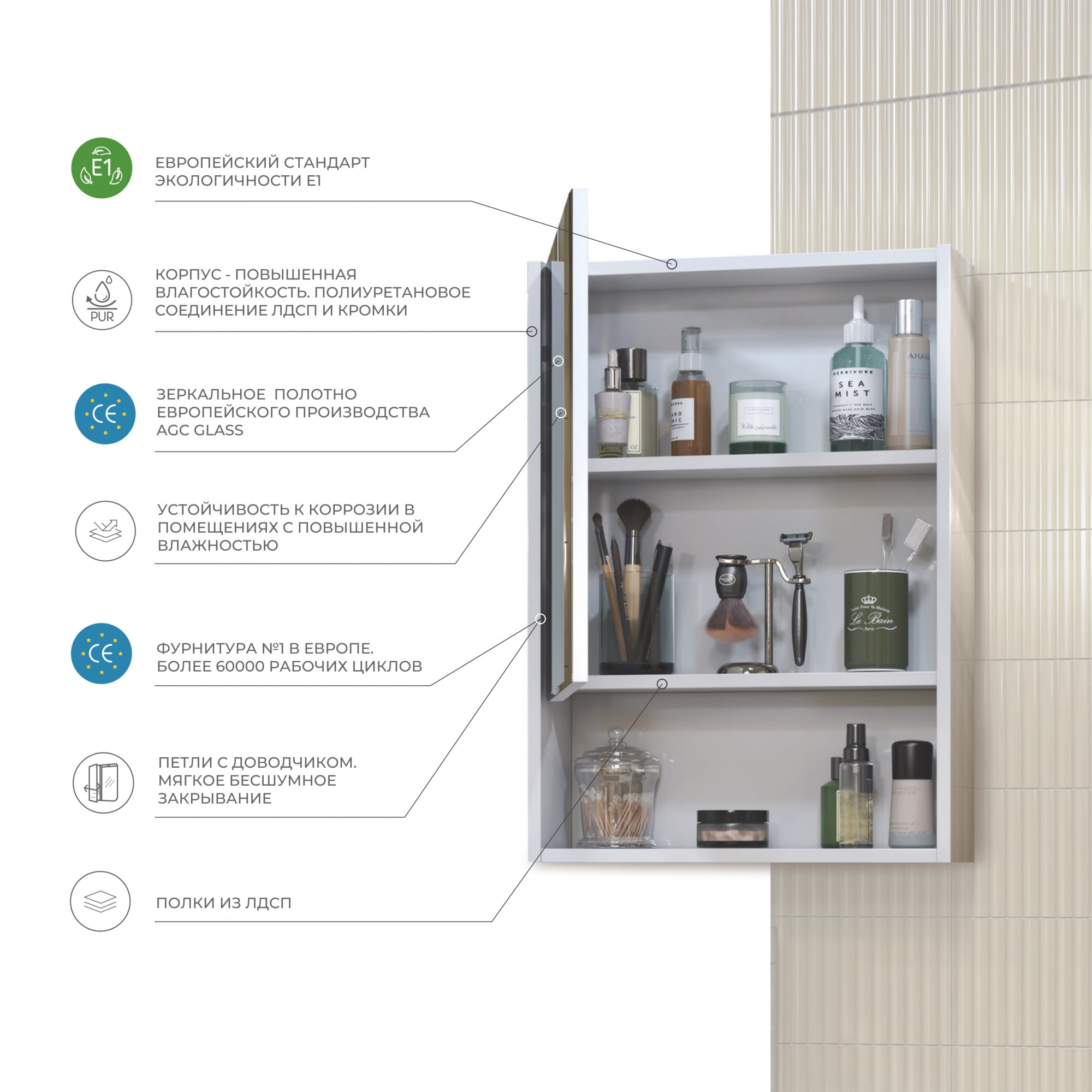 Оснащение: 1 дверца, петли с механизмом доводчика, зеркало с фацетом, 2 полки ЛДСП, 1 открытая полка снизу.