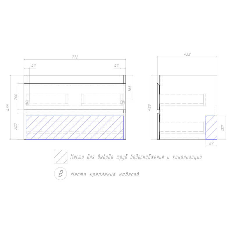 Оснащение: 2 выдвижных ящика, направляющие скрытого монтажа, 2 навеса.