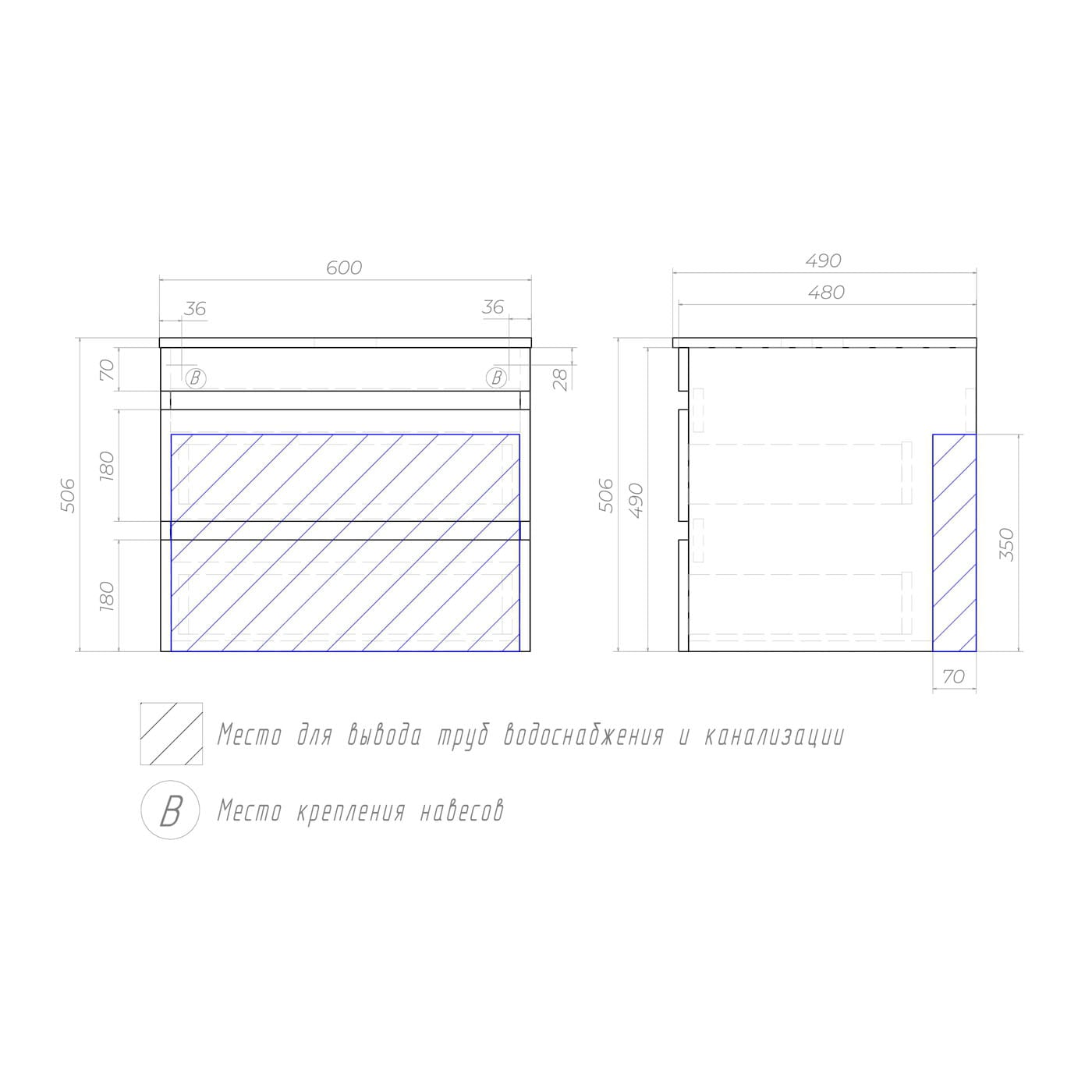 Оснащение: 2 ящика, шариковые направляющие полного выдвижения, 1 столешница с вырезом под сифон, 2 навеса, 1 сифон.