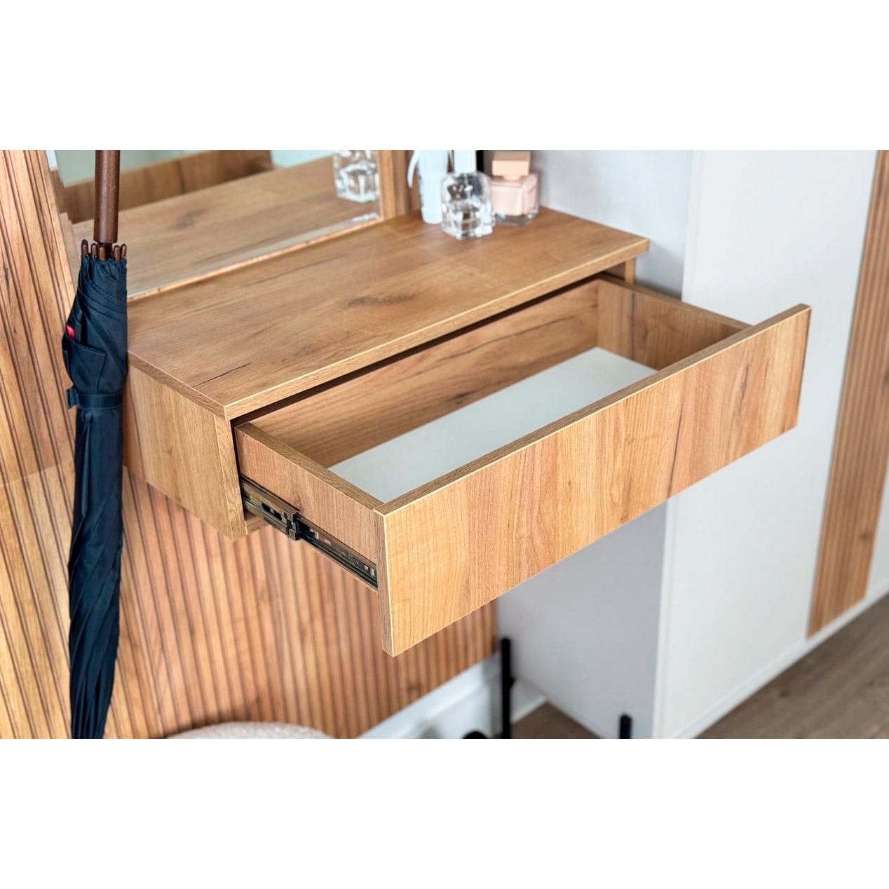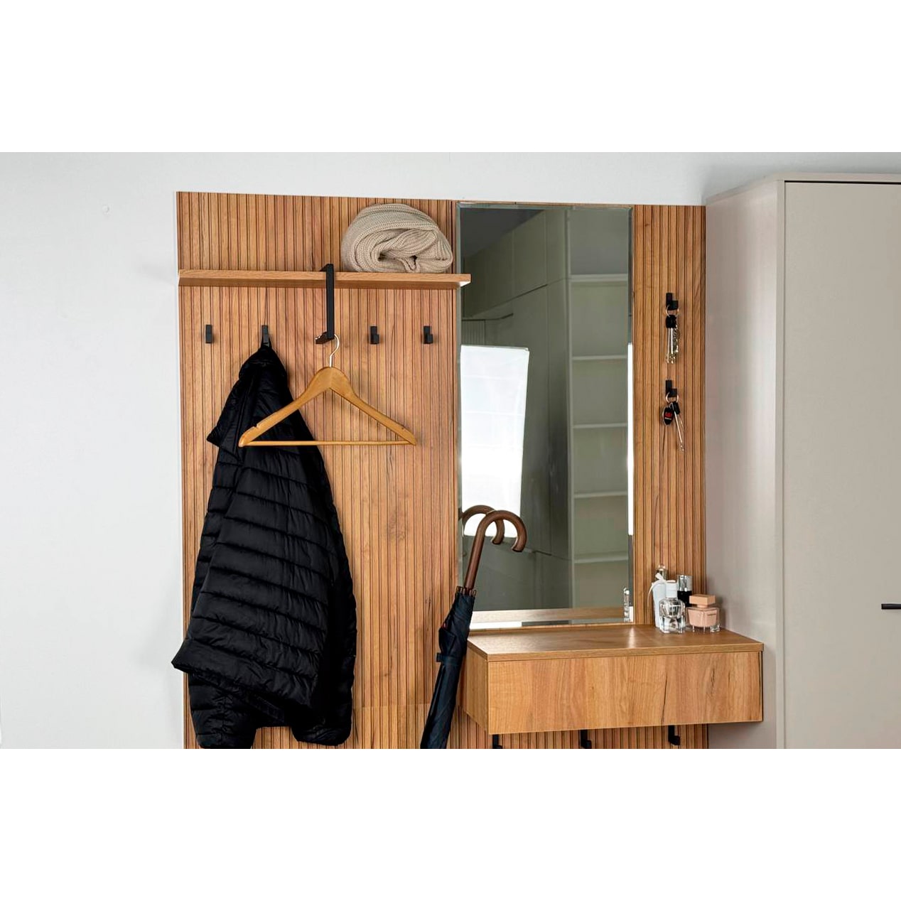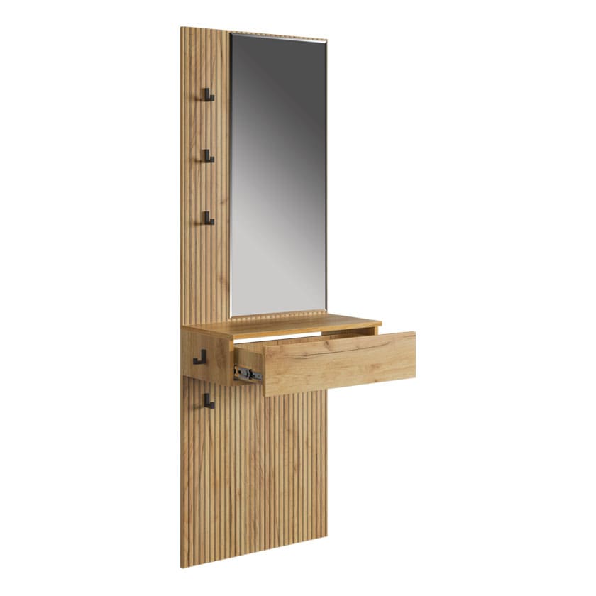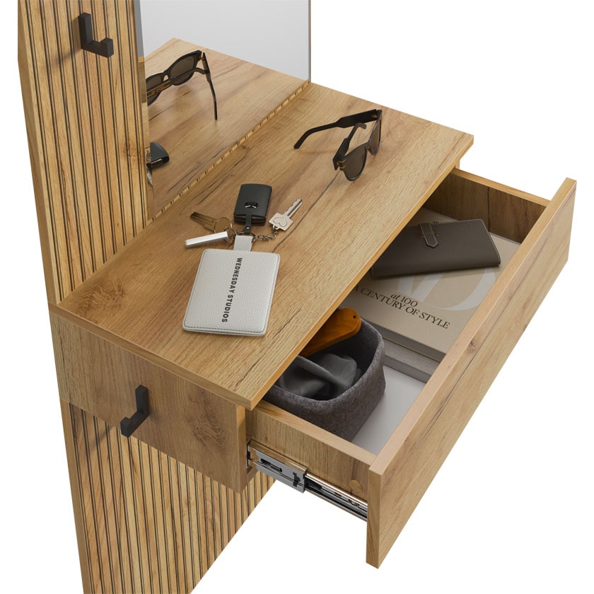 Крючки предоставляют удобное место для хранения сумок или аксессуаров. Выкатной ящик служит дополнительным пространством для хранения мелочей, таких как ключи, кошелек, косметика или другие небольшие предметы.