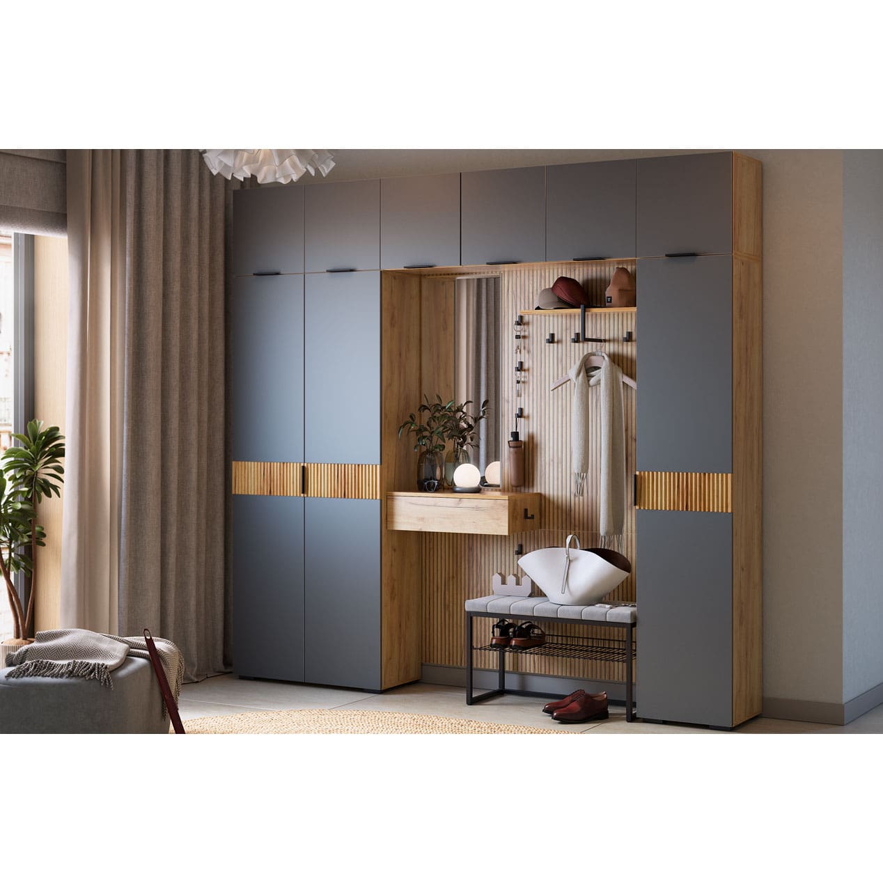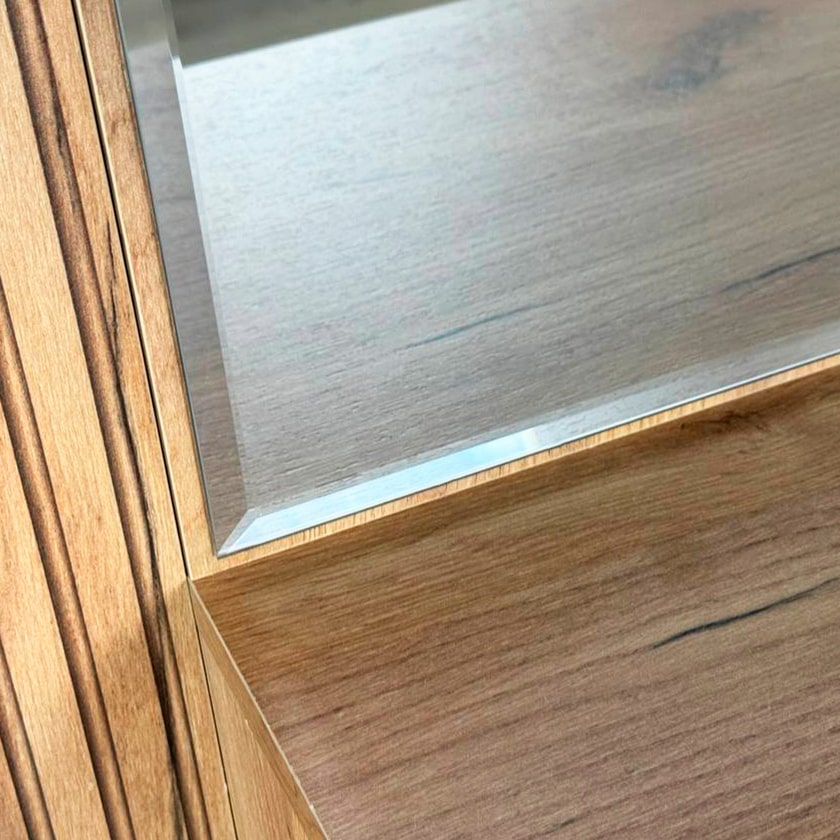 Принт, имитирующий вертикальную фрезеровку, придает зеркалу уникальный и современный вид, добавляя текстуру и глубину. Материал каркаса – ЛДСП, что обеспечивает прочность и долговечность, а также легкость в уходе.