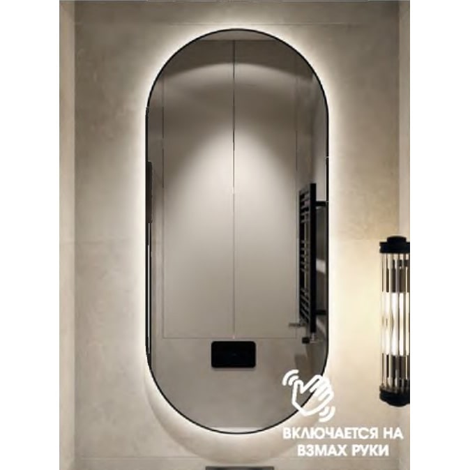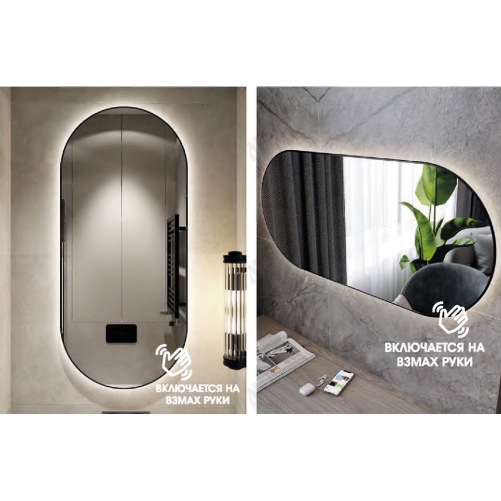 Примечание: зеркало оснащено пластинами для крепления к стене и светодиодной лентой с выключателем, срабатывающим от взмаха руки.